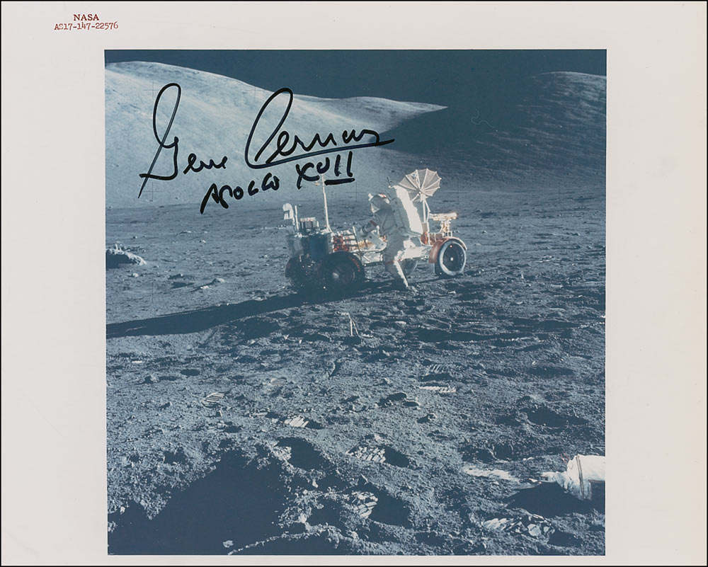 Color glossy 10 x 8 ‘red-numbered’ NASA photo of Cernan working by the lunar rover on the surface of the moon, signed in black felt tip, “Gene Cernan, Apollo XVII.” In fine condition, with a few scattered light surface marks.