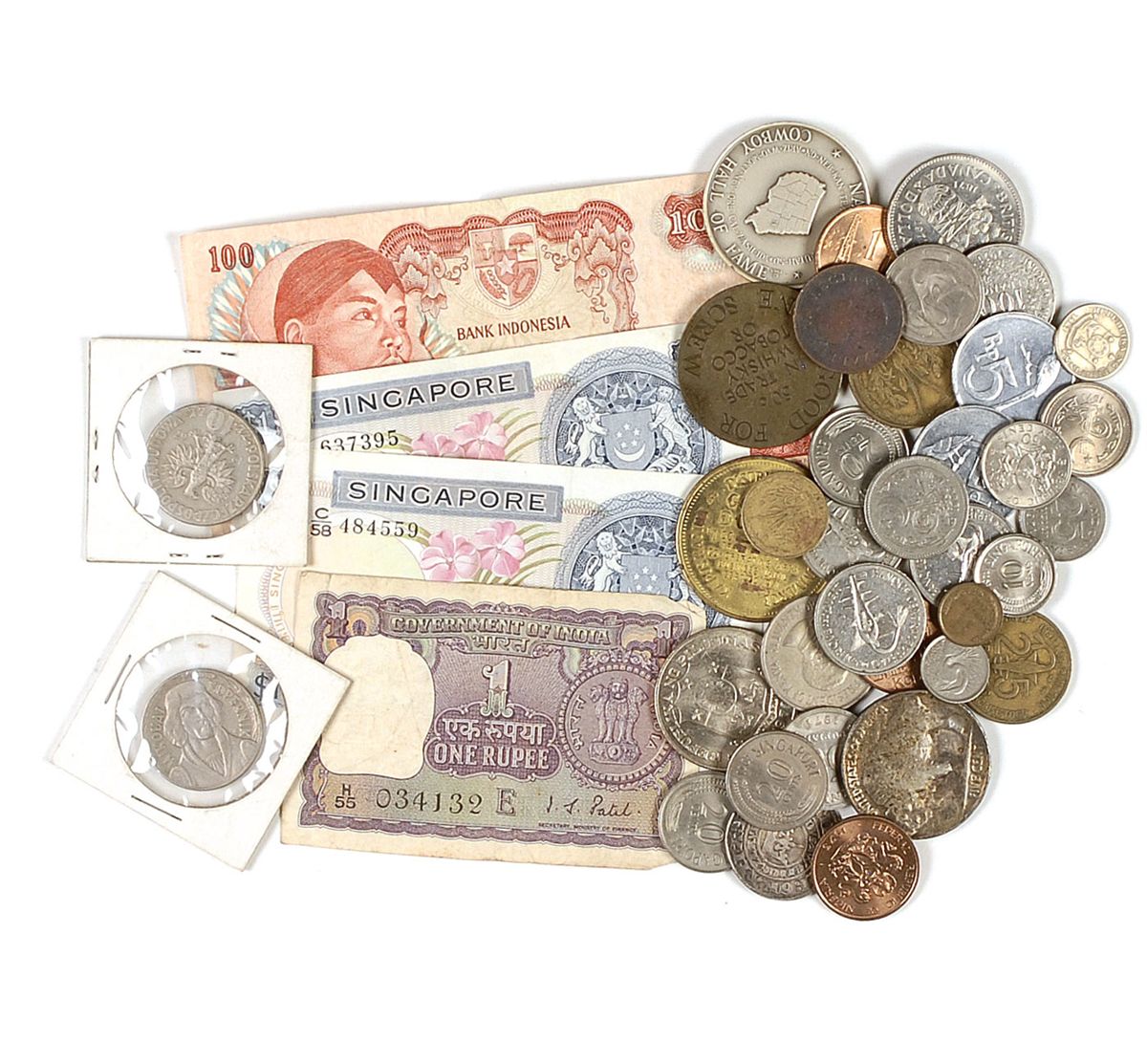 Forty items: an eclectic mix of paper currency, coins, and novelty pieces accumulated by Gene Cernan during a 1973 trip around the world. Countries include India, Indonesia, Singapore, France, and Nigeria. Accompanied by a certificate of authenticity from Novaspace.
