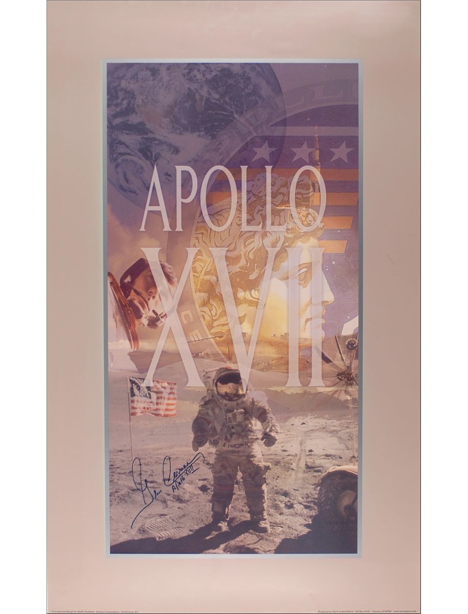 Color 22 x 35.5 print commemorating the Apollo 17 mission, featuring an image of Cernan on the lunar surface, signed in blue felt tip, “Gene Cernan, Apollo XVII.” Rolled and in fine condition. Accompanied by a certificate of authenticity from Novaspace.
