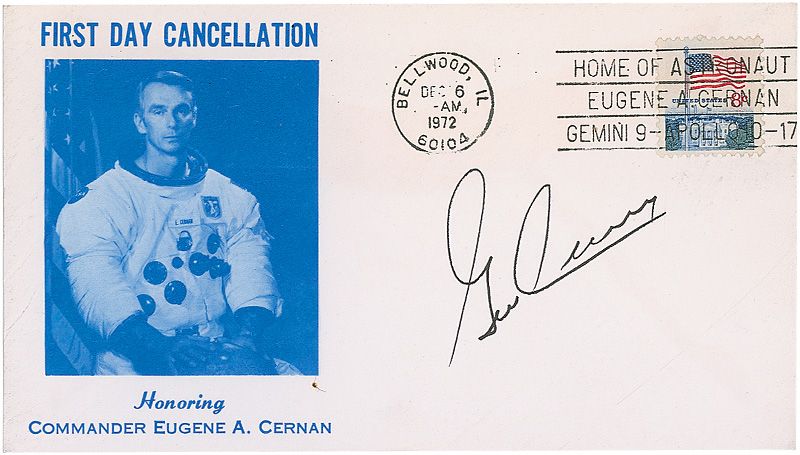 Two commemorative covers, one with a cachet honoring Cernan, the other with a cachet honoring the Apollo 10 recovery force, each signed in black ink by Cernan. In fine condition, with mild toning and small adhesive remnant to recovery cover.
