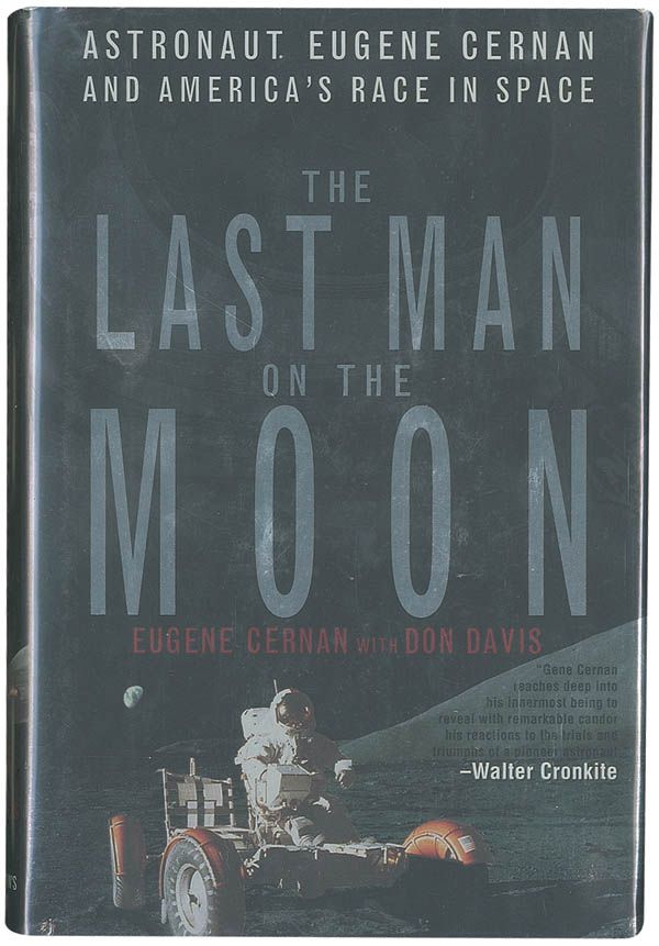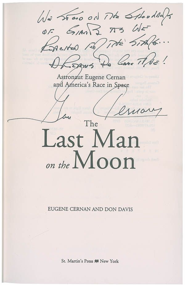 Signed book: The Last Man on the Moon. First edition, later printing. NY: St. Martin's Press, 1999. Hardcover with dustjacket, 6.5 x 9.5, 356 pages. Signed on the title page in black felt tip, “We stood on the shoulders of giants as we reached for the stars…Dreams do come true! Gene Cernan.” In fine condition.