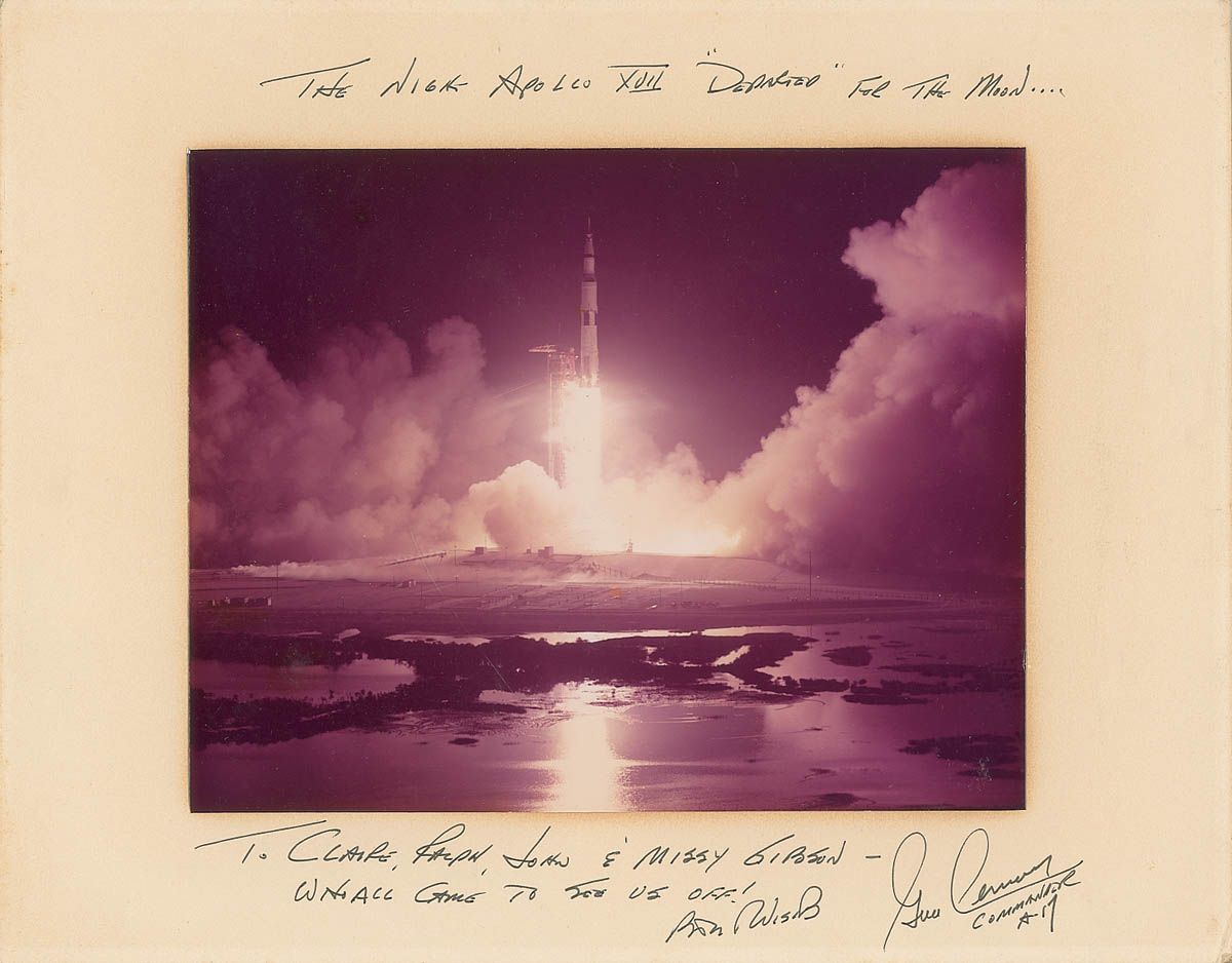 Color 9.5 x 7.5 photo of the liftoff of Apollo 17, affixed to its original 14 x 11 mount, signed and inscribed in black ink on the mount “The night Apollo XVII ‘departed’ for the Moon…To Claire, Ralph, John & Missy Gibson—Who all came to see us off! Best wishes, Gene Cernan Commander A-17.” In fine condition, with a couple of corner dings, uniform toning to mount from previous display, and some light vertical streaking to photo.