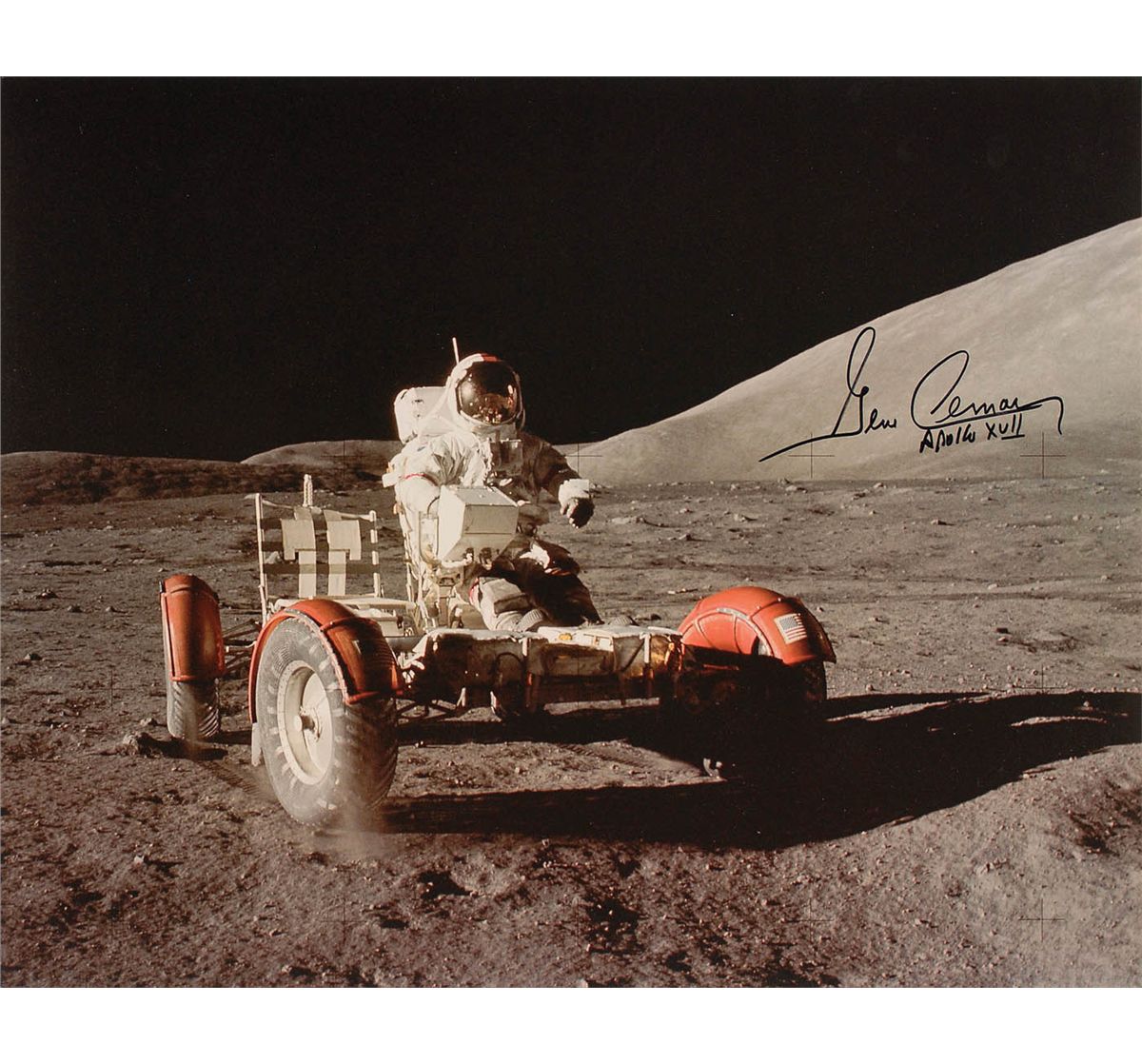 Color glossy 20 x 16 print of a NASA photo of Cernan driving the moon rover, bearing printed mission information on the reverse, signed in black felt tip, “Gene Cernan, Apollo XVII.” In fine condition.