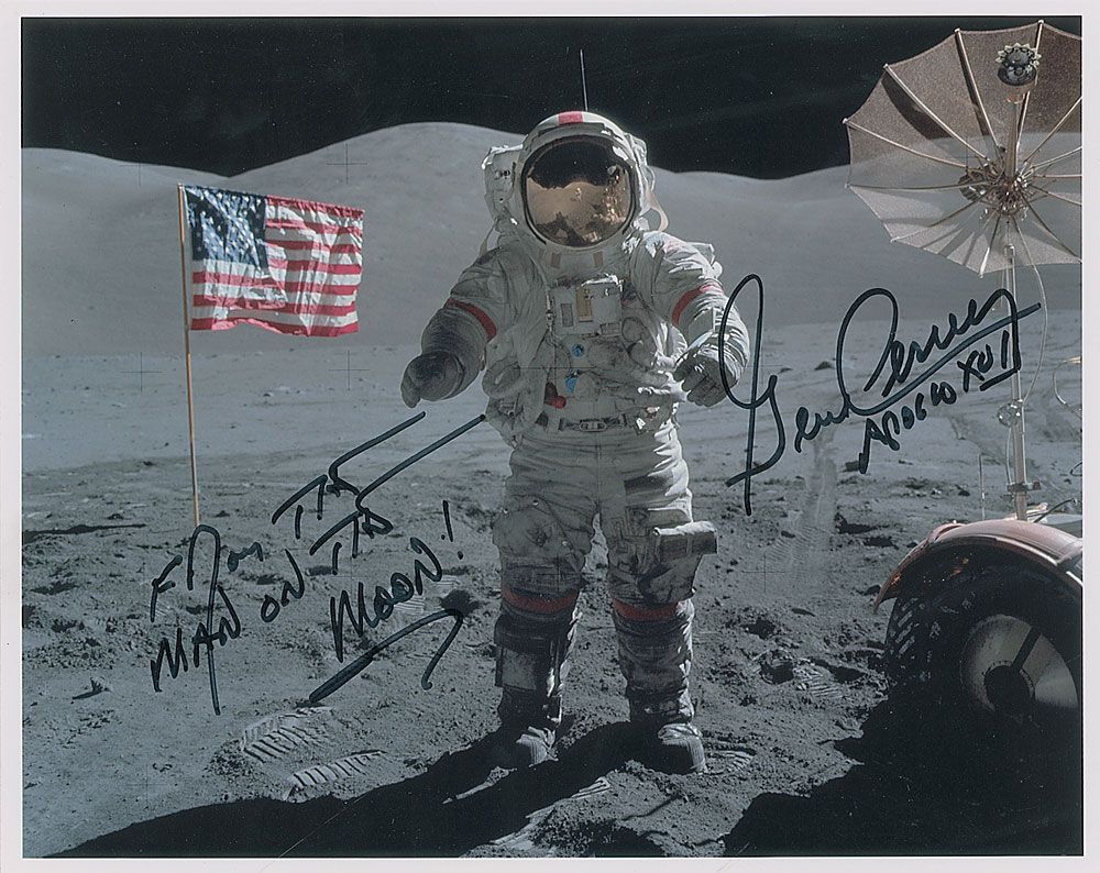 Color satin-finish 10 x 8 photo of Cernan posing on the lunar surface between the American flag and lunar rover, signed in black felt tip, “From the Man on the Moon! Gene Cernan, Apollo XVII.” In fine condition.