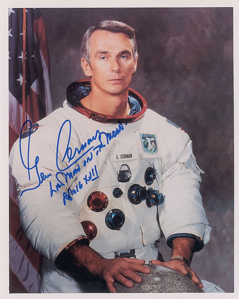 Color satin-finish 8 x 10 photo of Cernan in his white space suit, signed in blue felt tip, “Gene Cernan, Last Man on Moon, Apollo XVII.” In very fine condition.