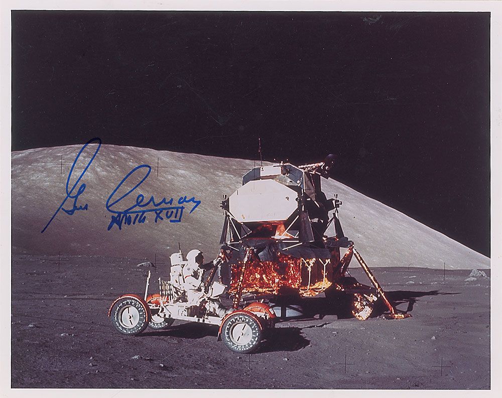 Color satin-finish 10 x 8 photo of Cernan in the lunar rover in front of the lunar module, signed in blue felt tip, “Gene Cernan Apollo XVII.” In very fine condition.