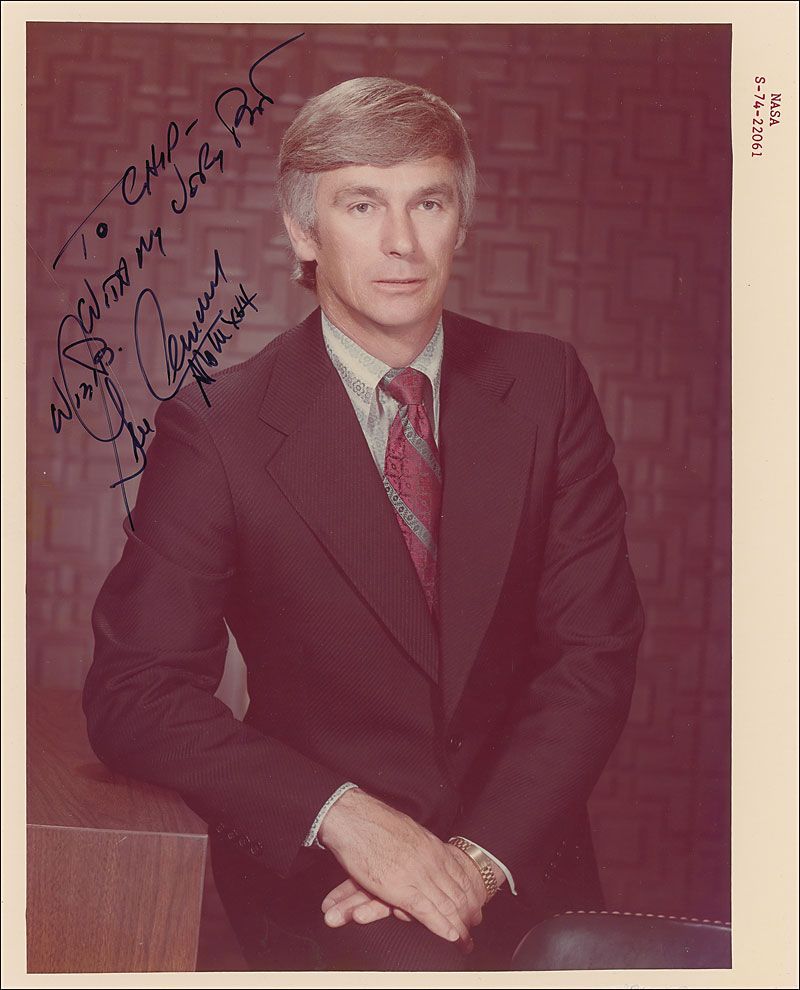 Color satin-finish 8 x 10 ‘red-numbered’ NASA photo of Cernan in a jacket and tie, signed and inscribed in black felt tip “To Chip—With my very best wishes, Gene Cernan Apollo XVII.” In fine condition, with some light surface loss to bottom edge, as well as a few small edge creases.