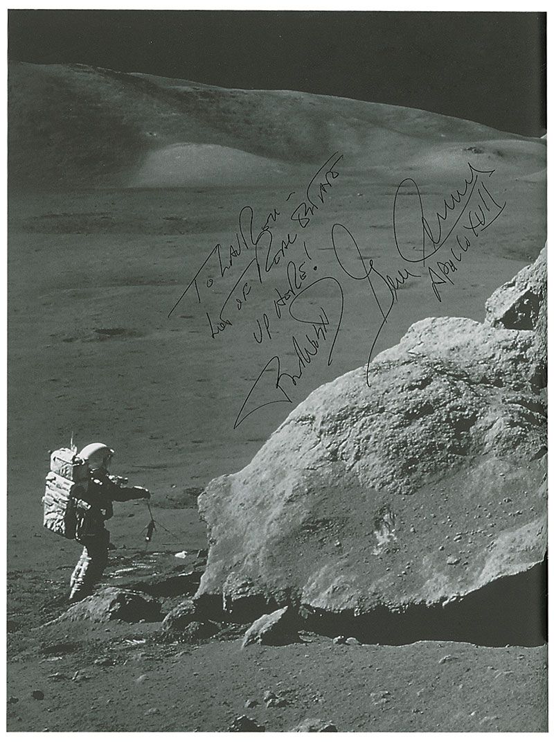 Signed book: Space: A Journey to Our Future. First edition, first printing. San Diego, CA: Tehabi Books, 2001. Softcover, 10 x 13, 72 pages. Signed and inscribed inside on an image of Harrison Schmitt next to Tracy's Rock in black felt tip, humorously adding, “Lots of Real Estate Up Here!” In fine condition.