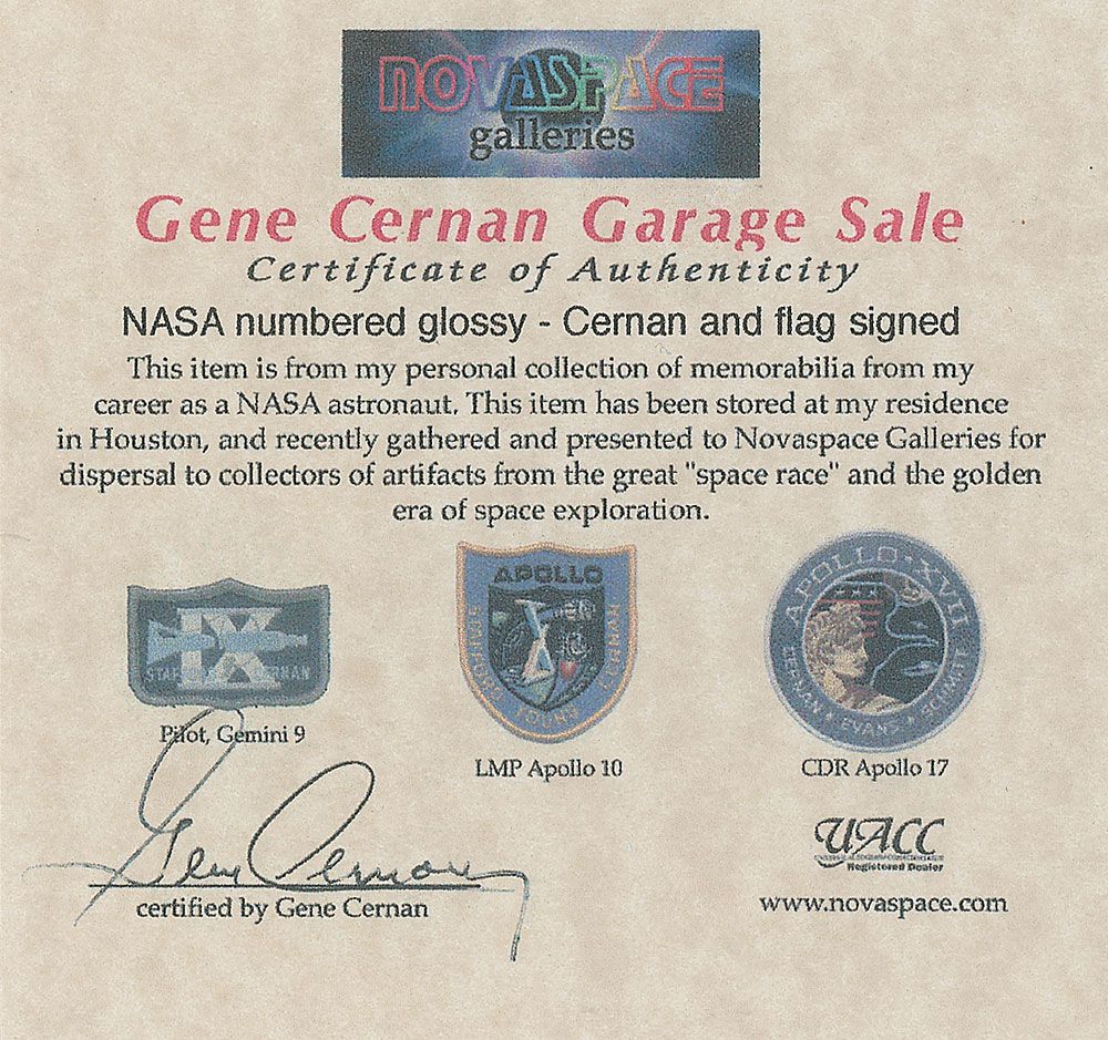 Uncommon color satin-finish 10 x 8 ‘red-numbered’ NASA photo of Cernan with the American flag on the lunar surface, signed in silver ink. In fine condition. Accompanied by a certificate of authenticity from Novapace, stating that the photo originates from Cernan’s personal collection.
