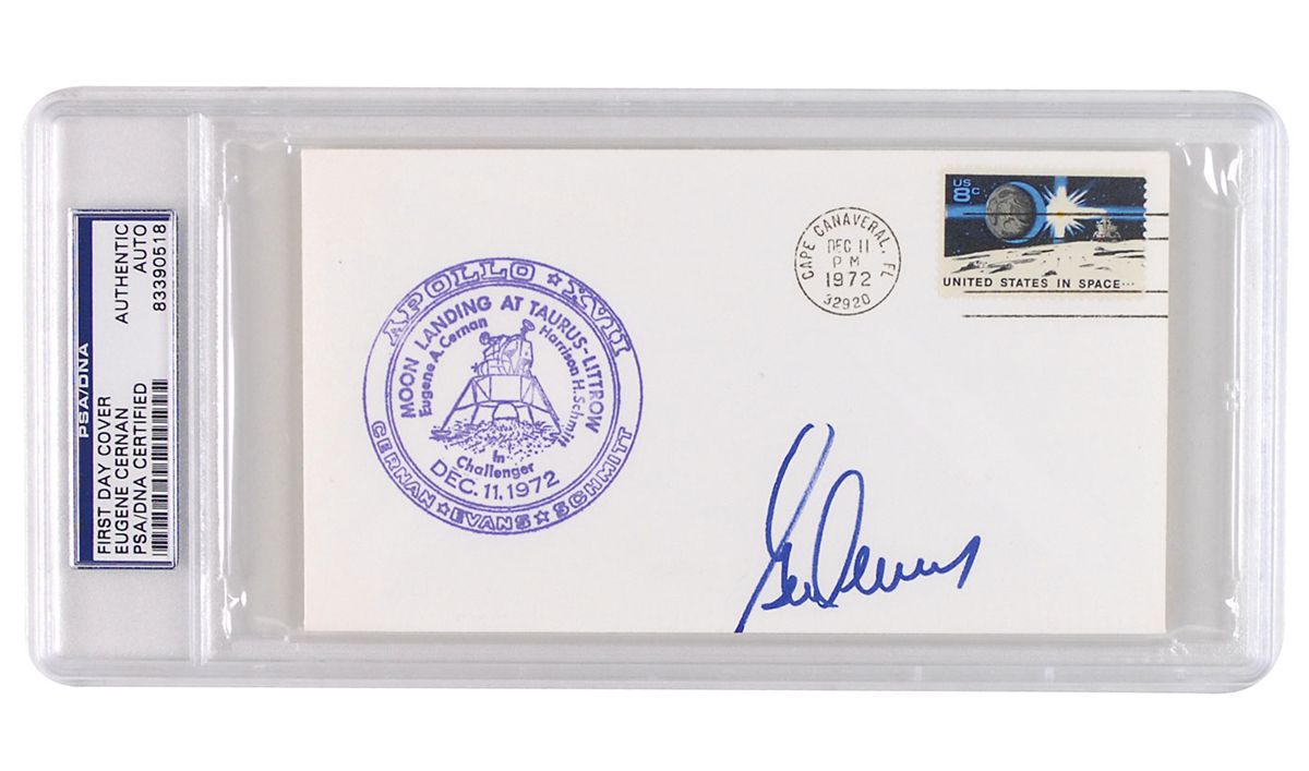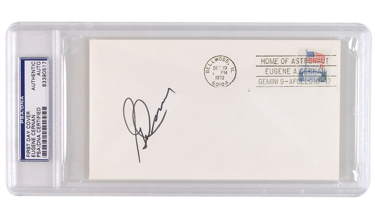 Two postal covers, one with a cachet honoring the Apollo 17 lunar landing; and one with a cancellation from Cernan’s home town of Bellwood, Illinois, each signed in blue or black felt tip by Cernan. Each is encapsulated in a plastic PSA/DNA authentication holder.
