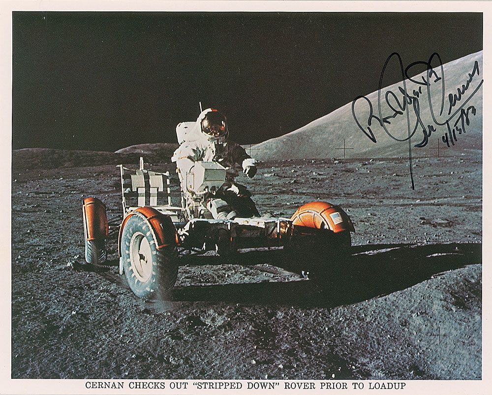 Color 10 x 8 NASA photo of Cernan with the lunar rover, signed in black felt tip, “Best wishes, Gene Cernan, 4/15/83.” In fine condition.