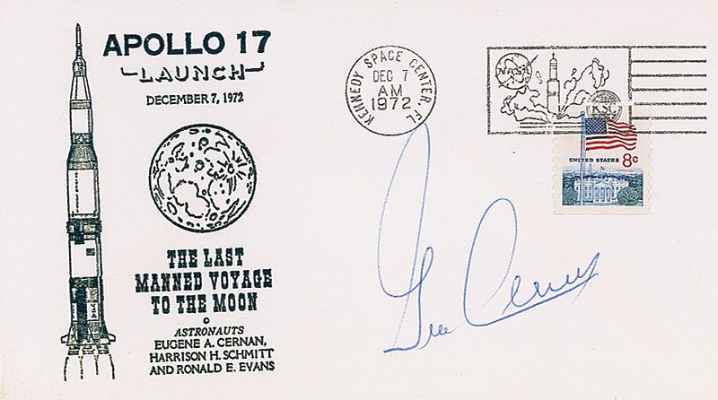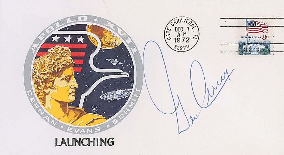 Two commemorative covers with cachets honoring Apollo 17, each signed in blue ballpoint. In overall fine condition.