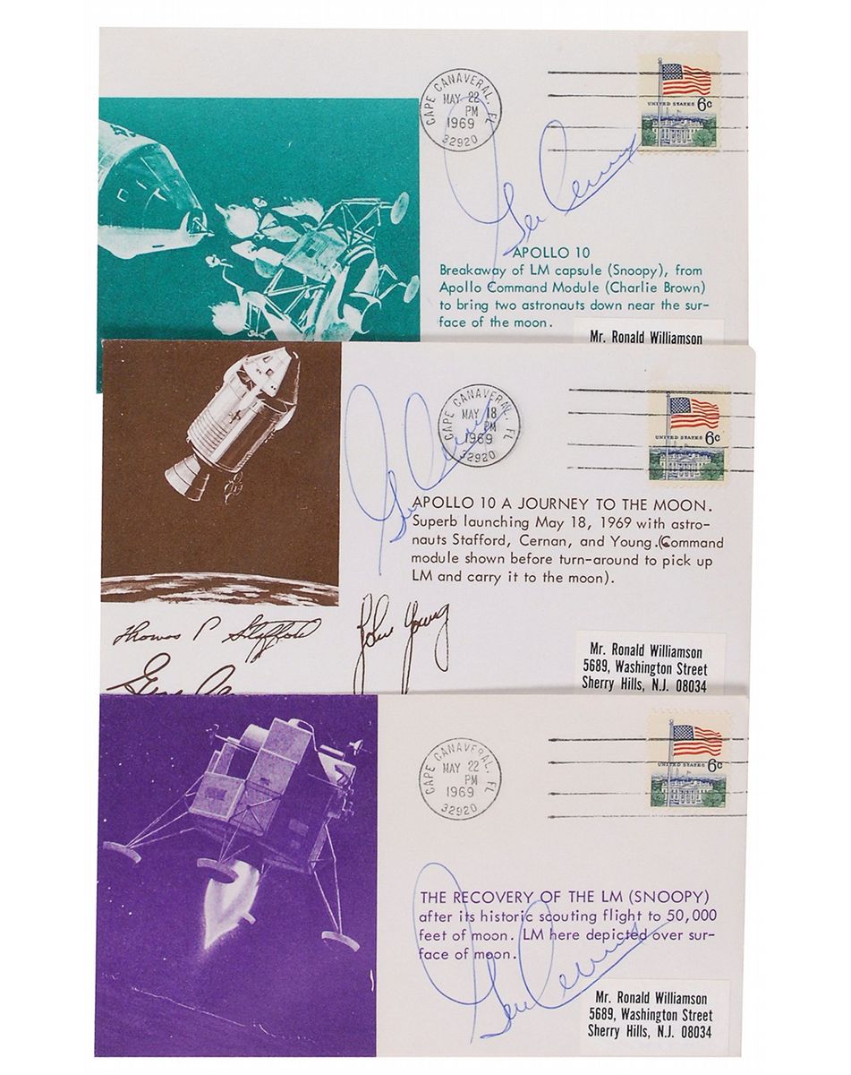Three commemorative covers with cachets honoring Apollo 10, each signed in blue ballpoint by Cernan. One cover also bears pre-printed signatures of the full crew. In overall fine condition.