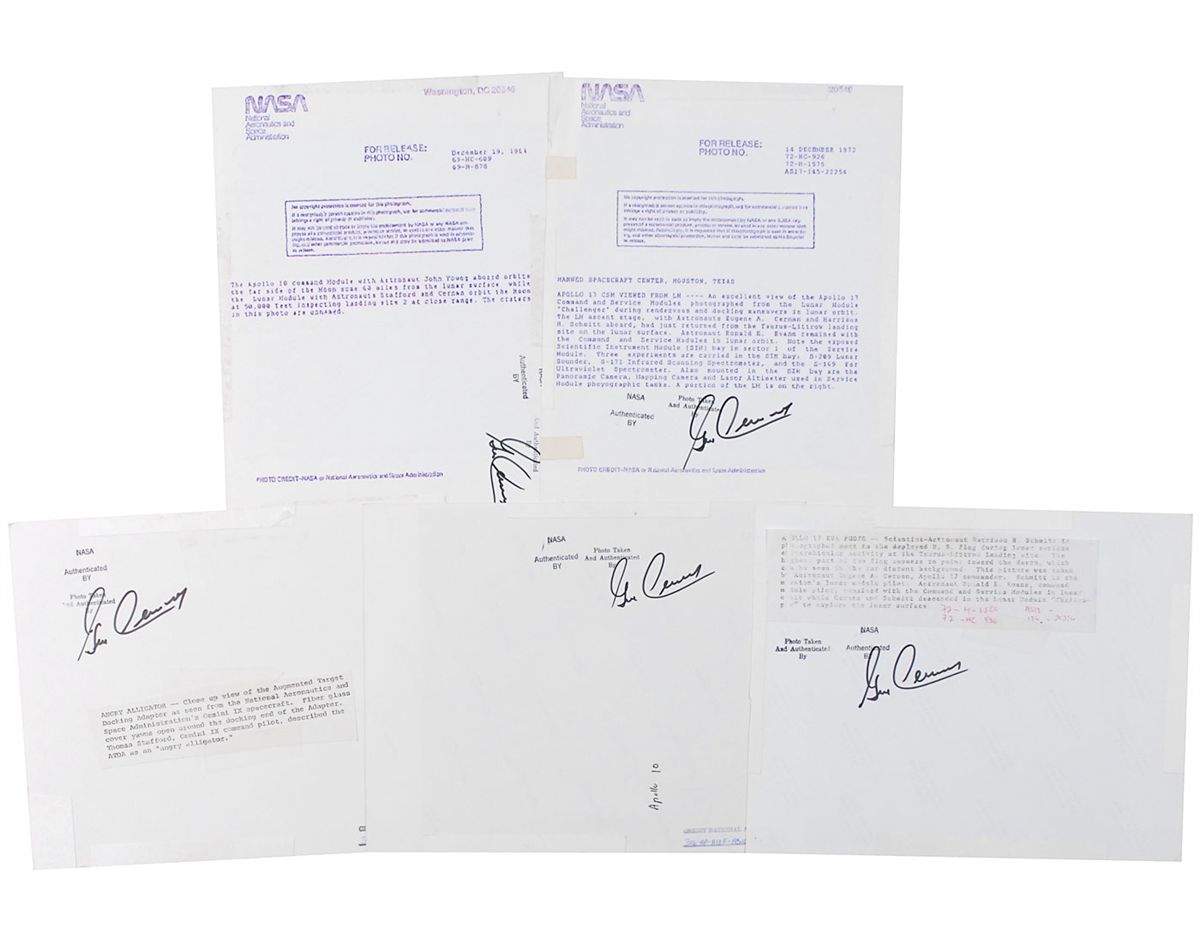 Five glossy and satin-finish 8 x 10 photos taken by Cernan, primarily during Apollo missions 10 and 17, with the reverse of each photo bearing a stamp that reads, “NASA authenticated by,” with all five signed below in black felt tip, “Gene Cernan.” In overall fine condition. Consignor notes that these originated from Cernan’s personal collection and were used in an exhibit that featured photographs he took while in space; he signed on the reverse to signify himself as the photographer.
