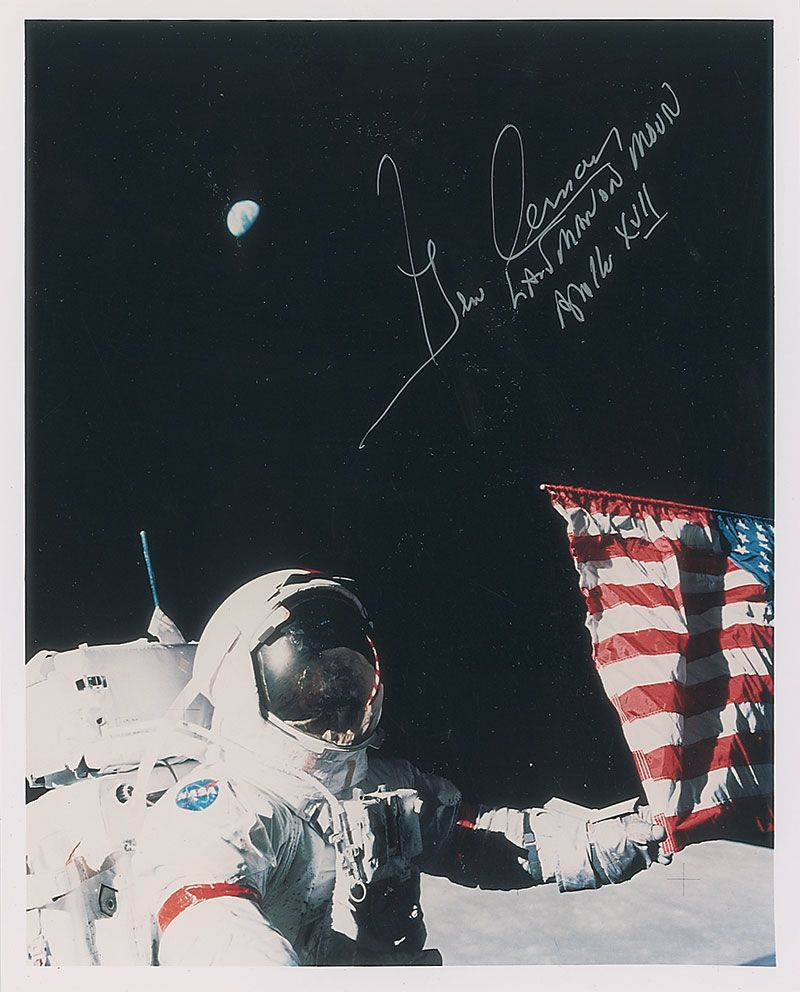 Color satin-finish 8 x 10 photo of Cernan with the American flag on the lunar surface, with the Earth far off in the distance, signed in silver ink, “Gene Cernan, last man on Moon, Apollo XVII.” In very fine condition.