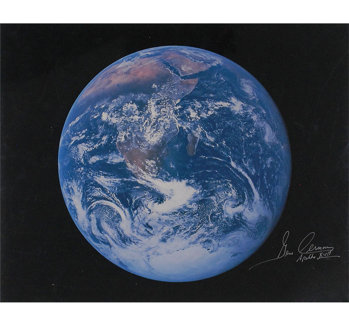 Color glossy 20 x 16 photo of the Earth taken from space, signed in silver ink. Rolled and in fine condition. Accompanied by a copy of a certificate of authenticity from Novaspace.