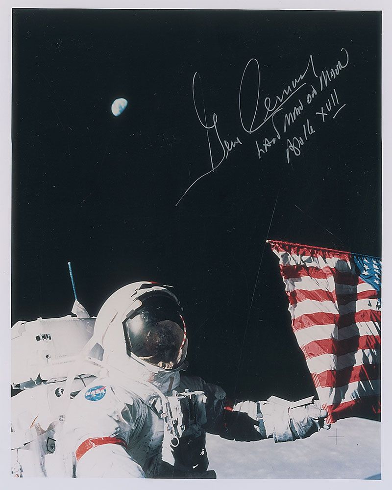 Color satin-finish 8 x 10 photo of Cernan with the American flag on the lunar surface, with the Earth far off in the distance, signed in silver ink, “Gene Cernan, last man on Moon, Apollo XVII.” In very fine condition.