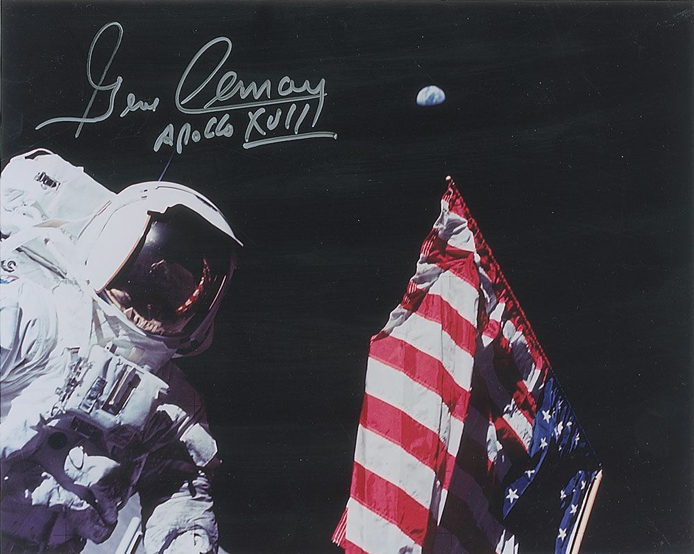 Color satin-finish 10 x 8 photo of Cernan with the American flag on the lunar surface, with the earth far off in the distance, signed in silver ink, “Gene Cernan, Apollo XVII.” In fine condition, with a few scattered light bends and creases. From the Leslie Cantwell collection.