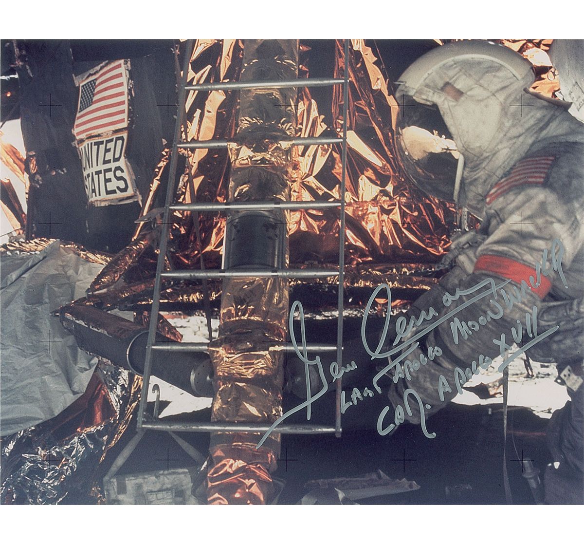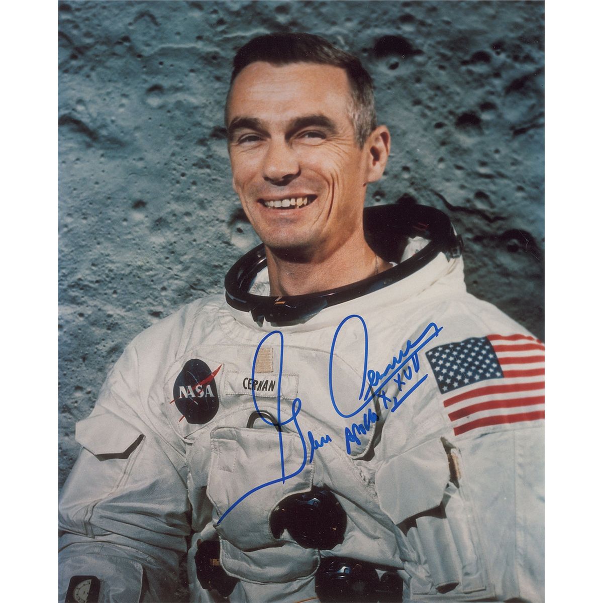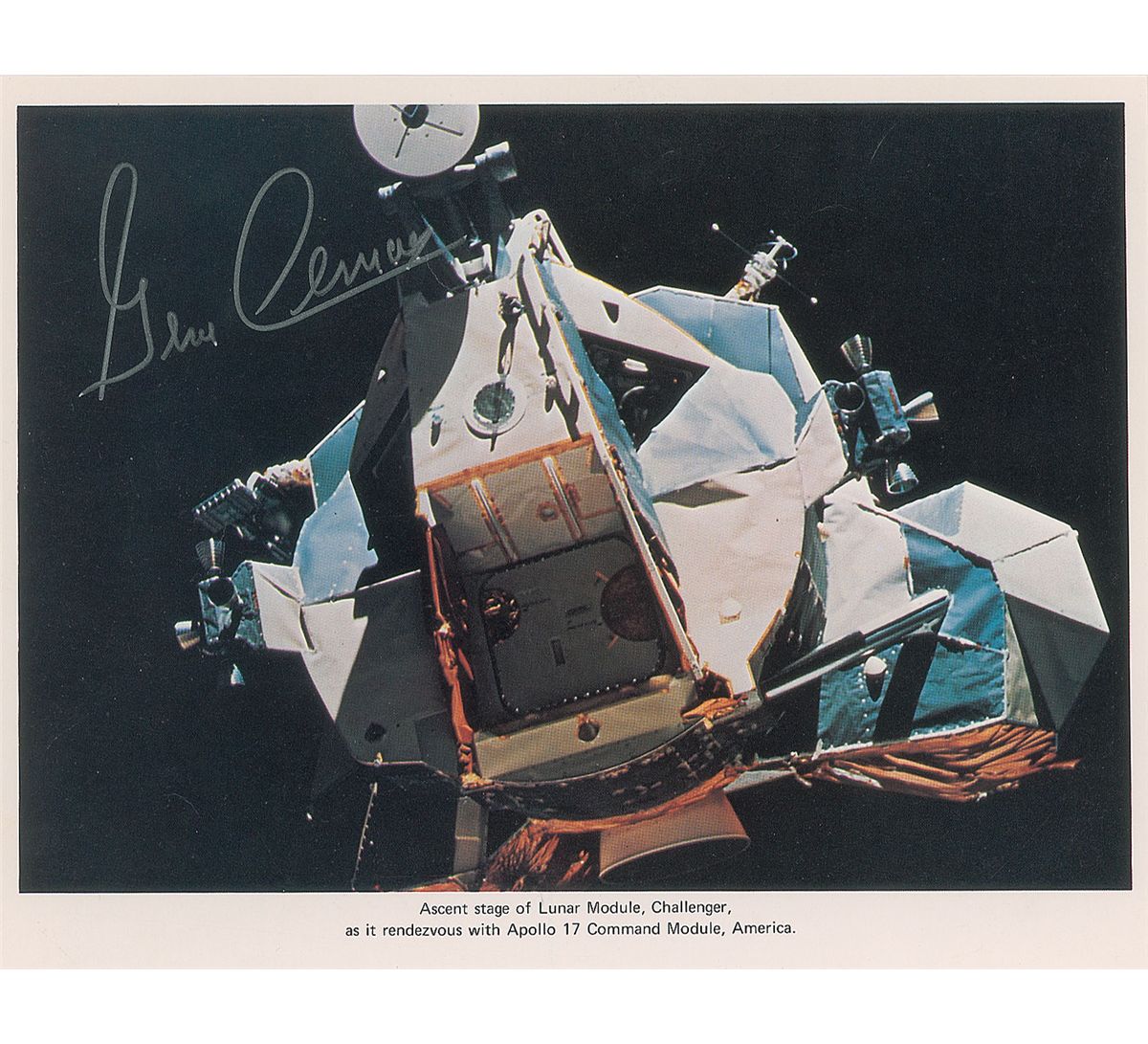 Three color photos, measuring 8 x 10 and 10 x 8, each signed in blue felt tip or silver ink by Cernan. In overall fine condition.