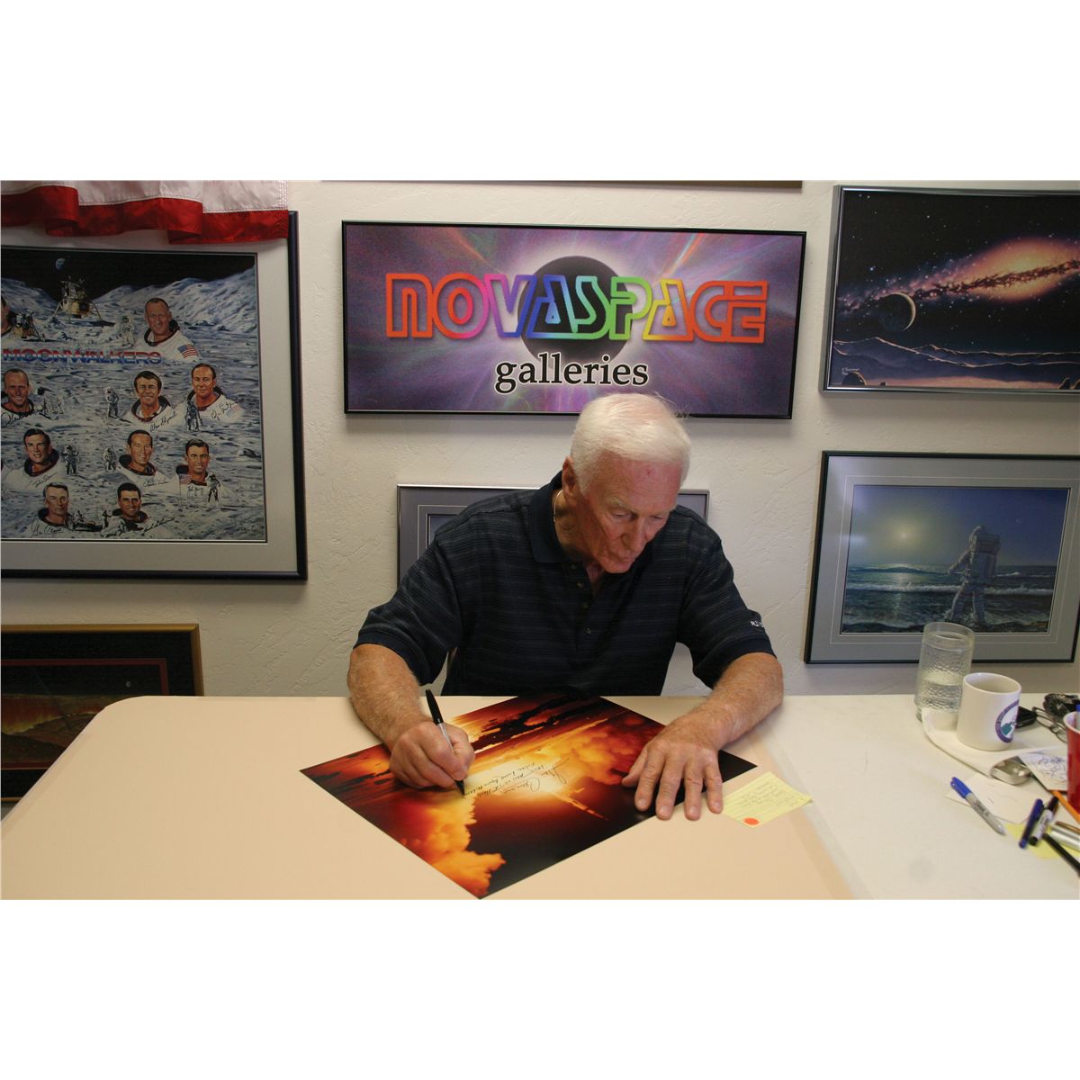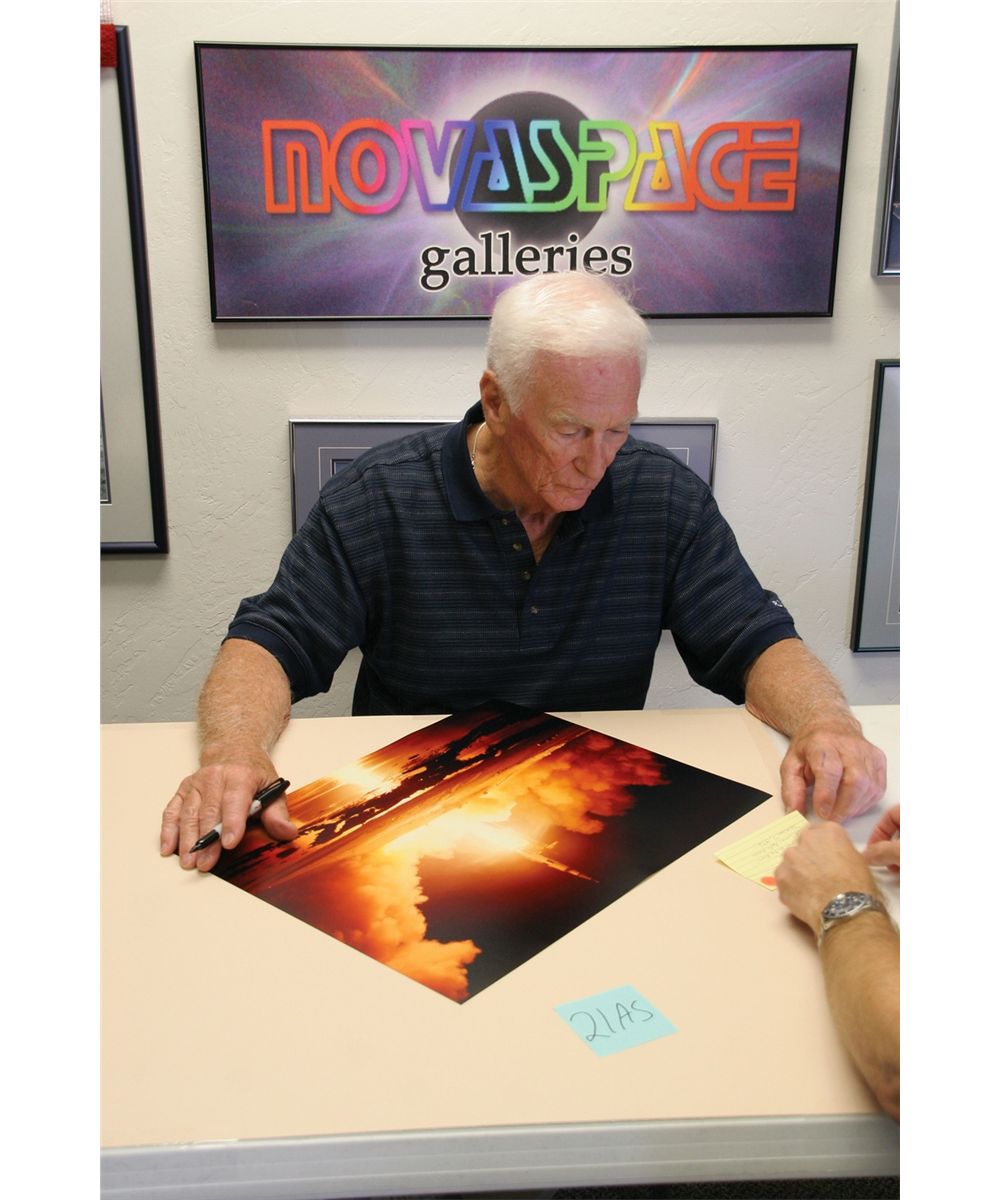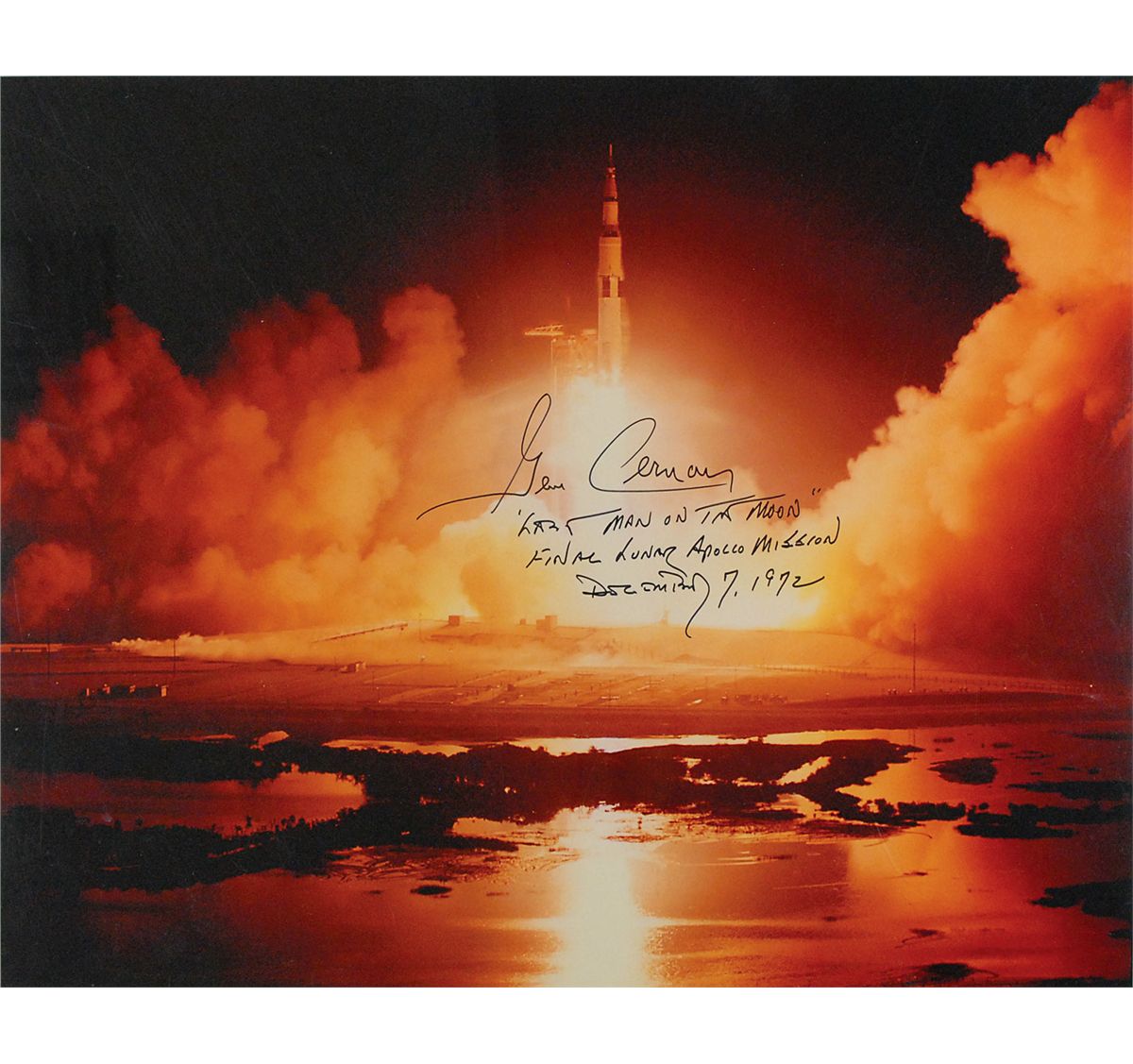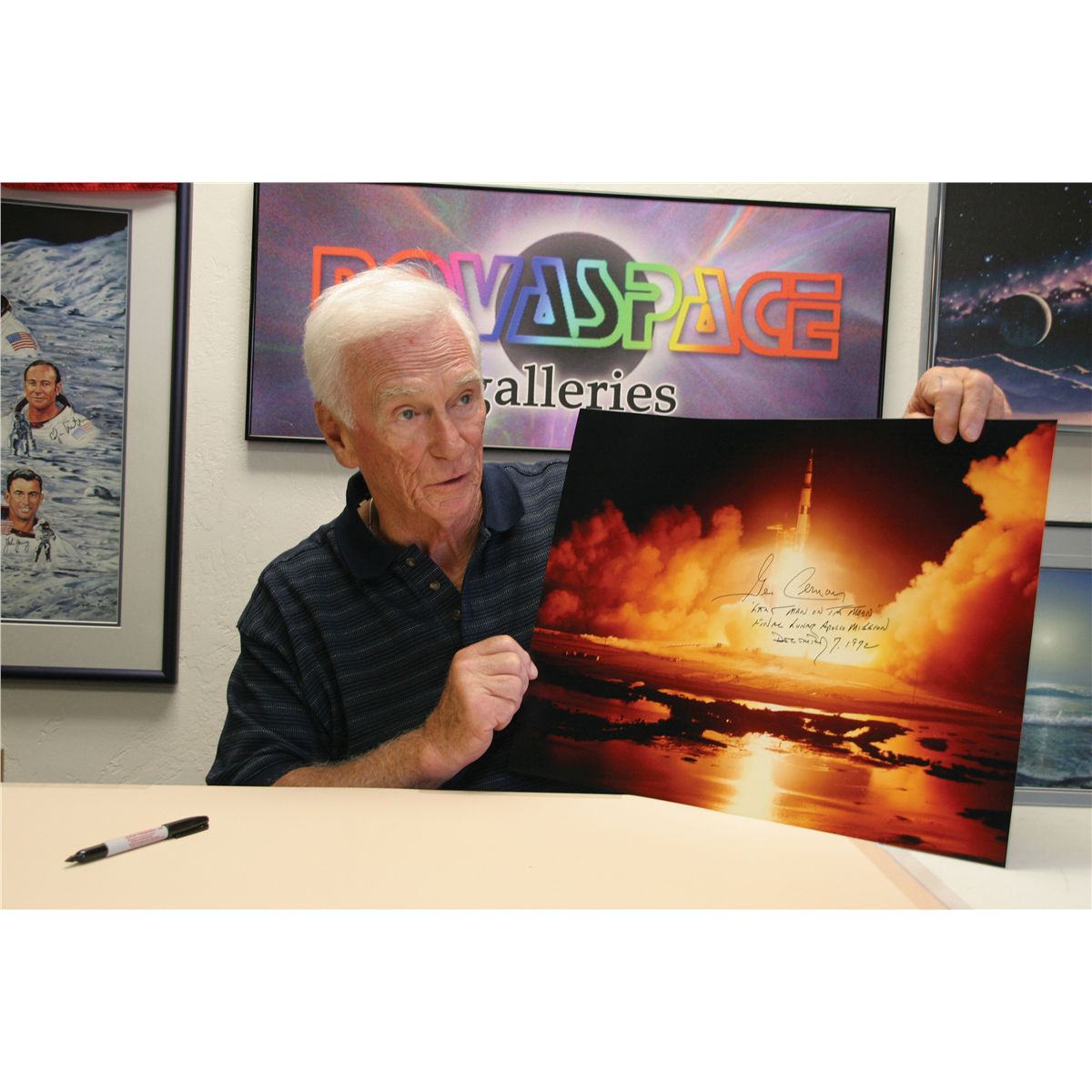 Impressive color satin-finish 20 x 16 photo of the Apollo 17 launch, signed in black felt tip, “Gene Cernan, ‘Last Man on the Moon,’ Final Lunar Apollo Mission, December 7, 1972.” Rolled and in fine condition.