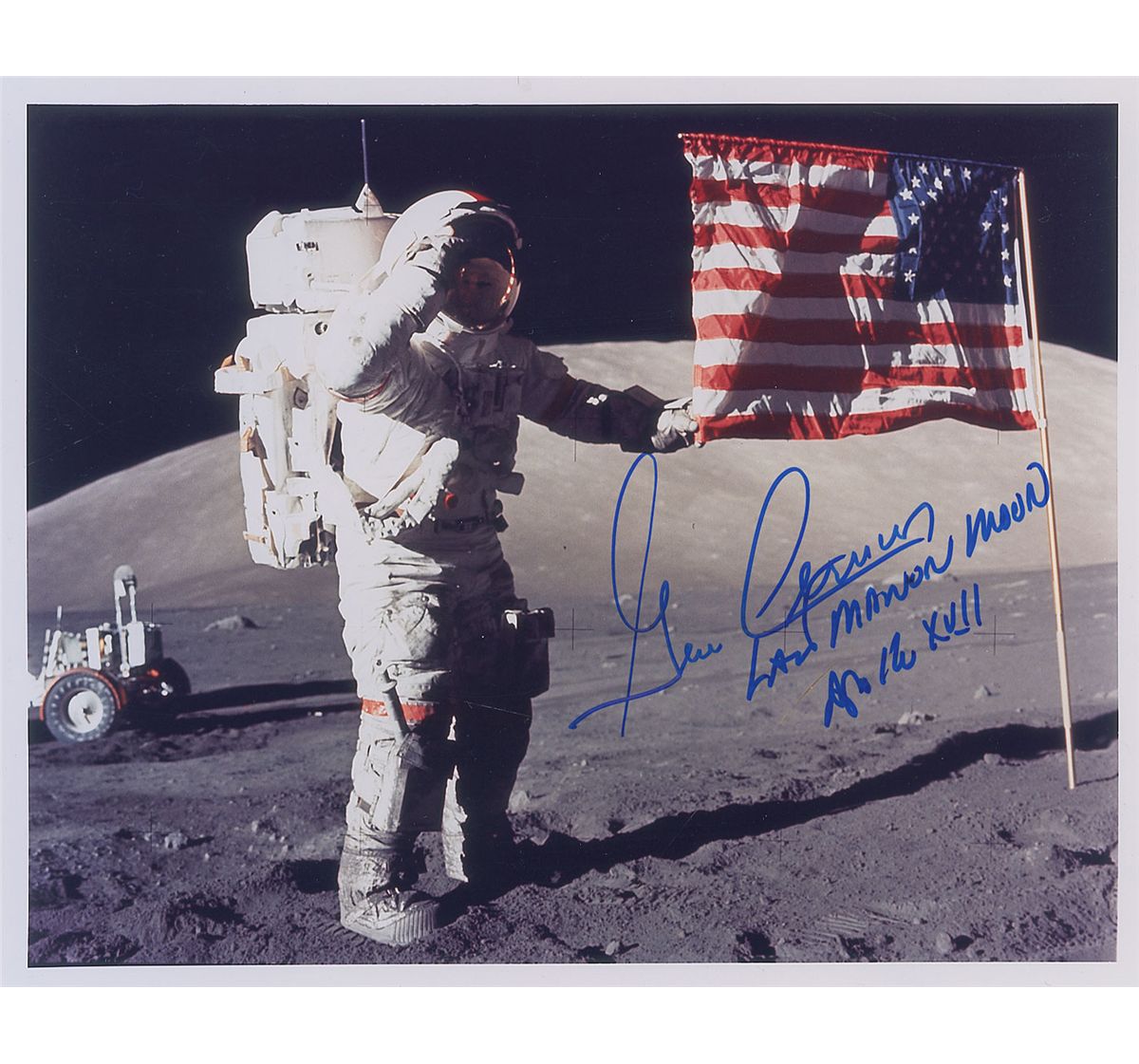 Color satin-finish 10 x 8 photo of Cernan saluting the American flag on the lunar surface, signed in blue felt tip, “Gene Cernan, Last Man on Moon, Apollo XVII.” In very fine condition.