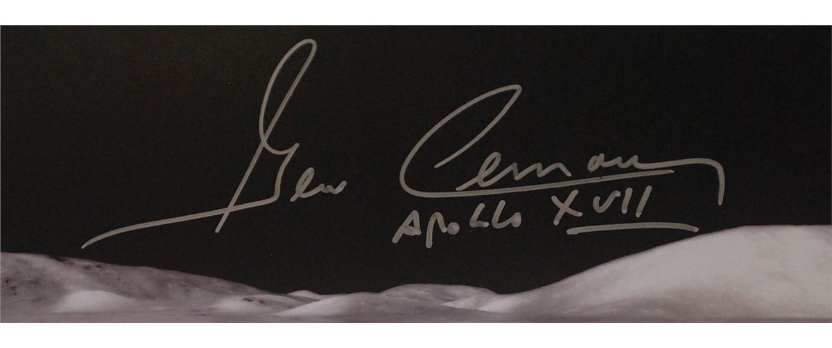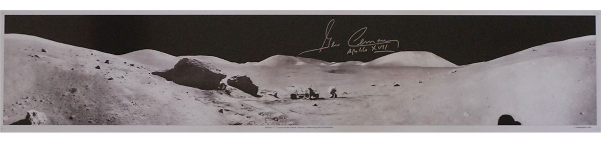 Impressive satin-finish 40.5 x 8.5 panoramic photo of Cernan deploying the gravimeter on the lunar surface, signed in silver ink, “Gene Cernan, Apollo XVII.” In very fine condition. Rolled.