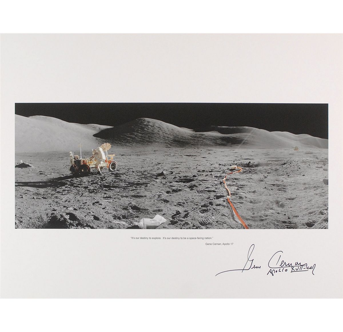 Very nice color print, 22 x 17, of Gene Cernan working by the lunar rover, featuring a printed quote from Cernan that reads, “It’s our destiny to explore. It’s our destiny to be a space-faring nation,” and signed in the lower border in black felt tip, “Gene Cernan, Apollo XVII—CDR.” In fine condition.
