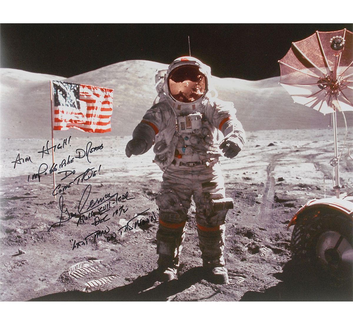 Fabulous crystal-clear color satin-finish 20 x 16 photo of Cernan on the lunar surface, signed in black felt tip, “Aim high! Impossible dreams do come true! Gene Cernan, Apollo XVII–CDR, Dec. 1972, ‘Last man on the moon.’” In very fine condition.