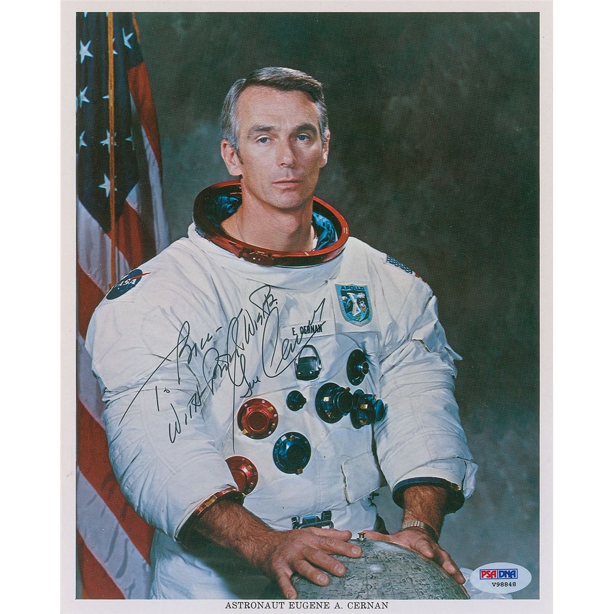 Official color 8 x 10 NASA lithograph of Cernan in his white space suit, signed and inscribed in black felt tip, “To Bill—With Best Wishes, Gene Cernan.” In fine condition, with a PSA/DNA label affixed to the lower right corner. Accompanied by a certificate of authenticity from PSA/DNA.