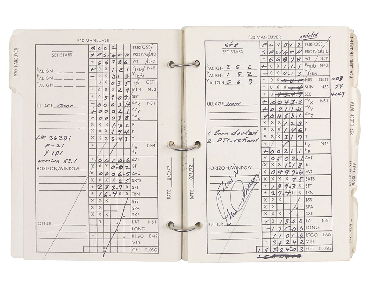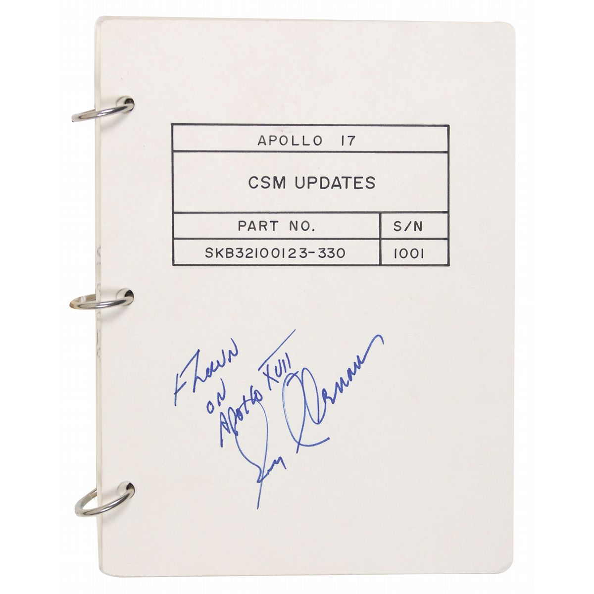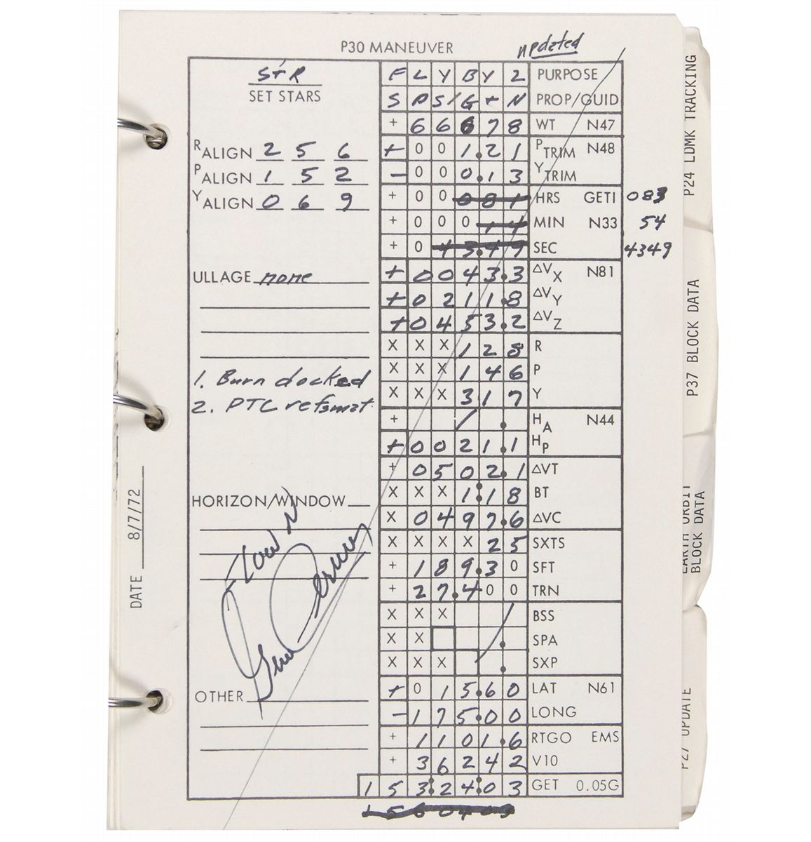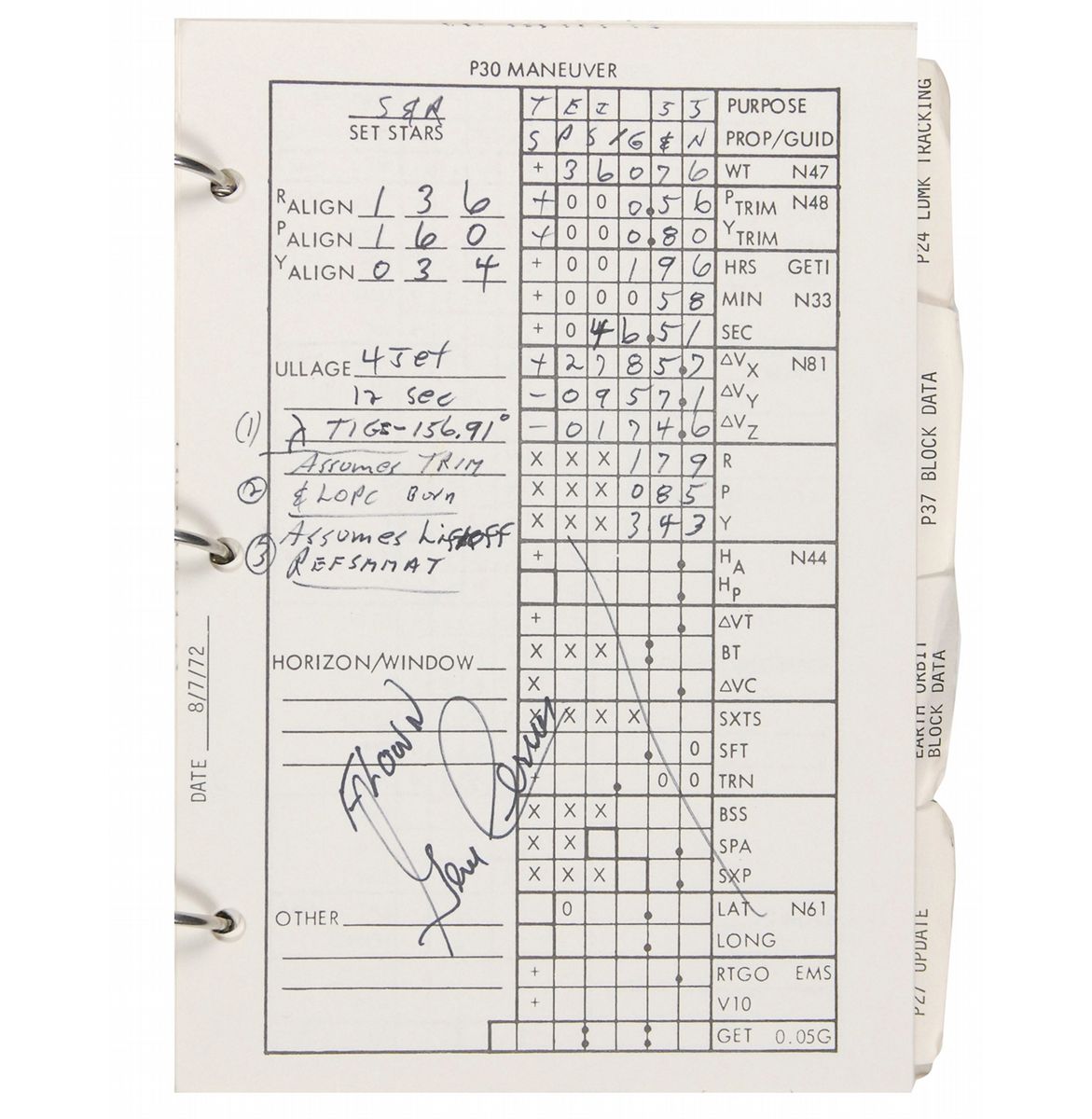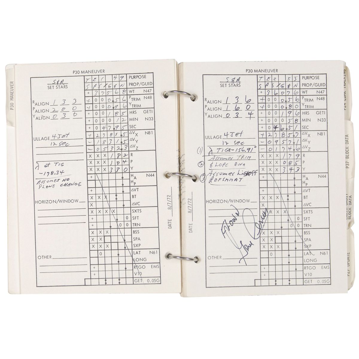 Complete flown Command Service Module Updates checklist carried aboard Apollo 17, used by the entire crew and heavily annotated by Harrison Schmitt or Ron Evans. Checklist consists of 53 heavy cardstock 6 x 8 pages (including covers) bound by 3 metal rings, titled on the front, “Apollo 17, CSM Updates, Part No. SKB32100123–330, S/N 1001,” and boldly certified and signed on the cover by Cernan in blue felt tip, “Flown on Apollo XVII, Gene Cernan.” Of the 51 pages within the checklist, there are 25 pages with writing on them, 21 are heavily noted by Schmitt and Evans with PADs, and four otherwise blank pages are certified and signed by Cernan, “Flown, Gene Cernan.” Each page is dated “8/7/72,” and all but the title page are double-sided. There are six tabs in the checklist: “P30 Maneuver,” “P37 Block Data,” “Earth Orbit Block Data,” “P27 Update,” “P24 LDMK Tracking,” and lastly, “Flight Plan Update.” Cernan has written flown certifications in black felt tip inside the checklist twelve times, each on separate pages (including all tabbed pages except for the first), “Flown, Gene Cernan.” Schmitt and Evan’s mission notes, in bold black felt tip, are all located on the first 11 pages (each double-sided) under the beginning “P30 Maneuver” tab. These pages list subjects such as: “Set Stars,” “R Align,” “P Align,” “Y Align,” “Ullage,” and six columns on which Schmitt and Evan’s recorded a multitude of numbers. Some of their handwritten notes on these pages read: “1. Burn Docked, 2. PTL reformat, 3. LM 36281,” “LM 36281, P - 21, Y - 181, perilun 53.1,” “Burn docked, PTC reformat,” “1. Burn docked, 2. LOI refsmat,” “LM 36312, SING BK 6:51,” “1. Burn and k, 2. Assume DOI-I,” “1. Burn and k, 2. Assume No Circ., 3. -140.9° Long (Lunar) At TIG,” “1. Burn und k, 2. Assume CIRC, 3. -147.62° Lunar Long at Tig,” “At TIG - 178.34, Assumes no plane change,” “4 Jet, 12 sec, TIG = -156.91°, Assumes Trim & LOPC burn, Assumes liftoff refsmmat.” Six of Cernan’s twelve handwritten flight certifications, “Flown, Gene Cernan,” are located on these first eleven pages within the “P30 Maneuver” tab.