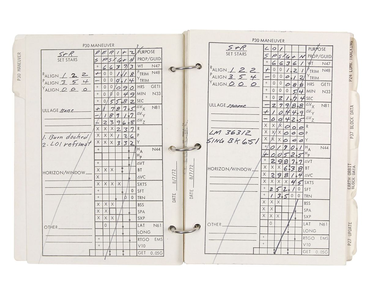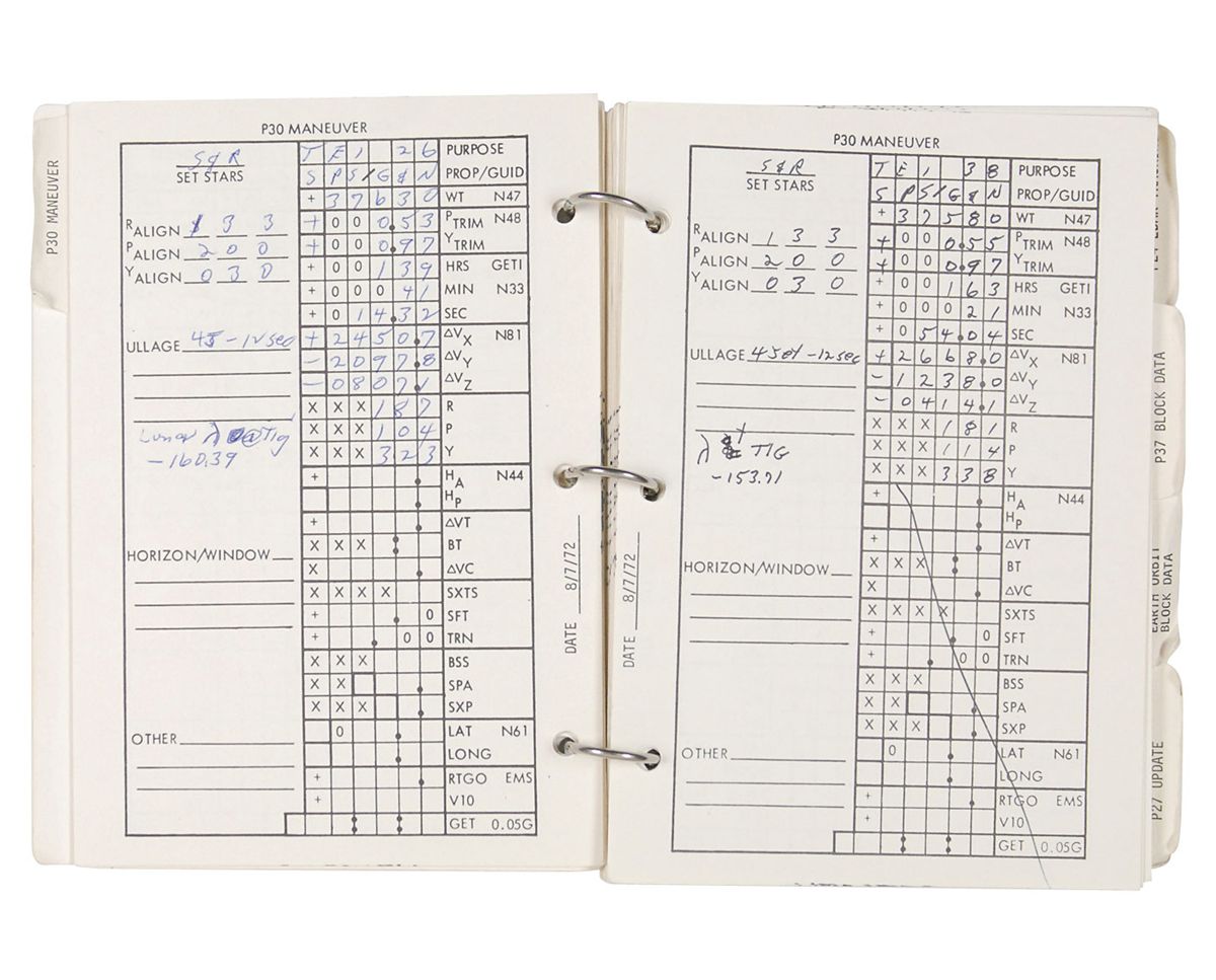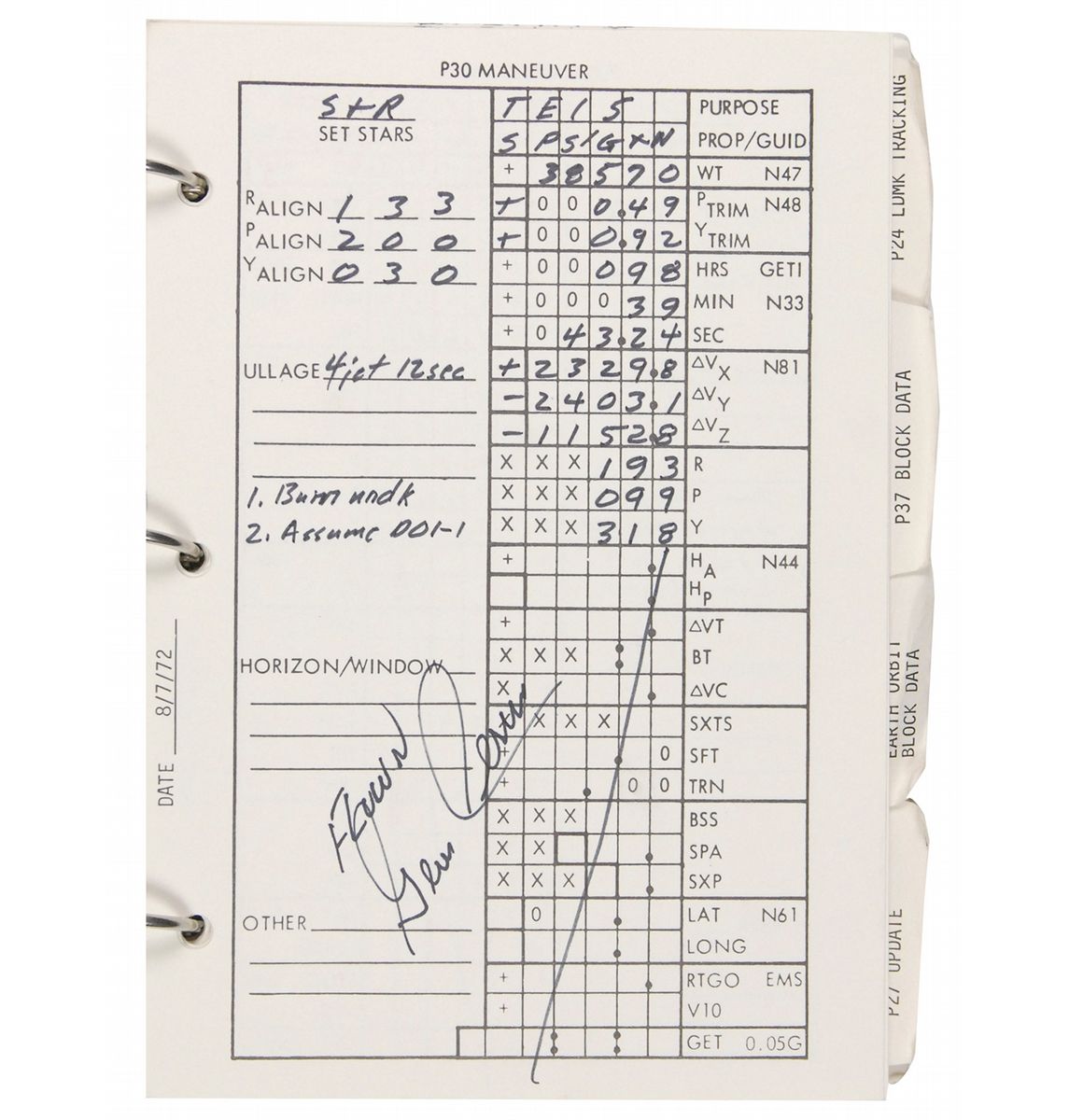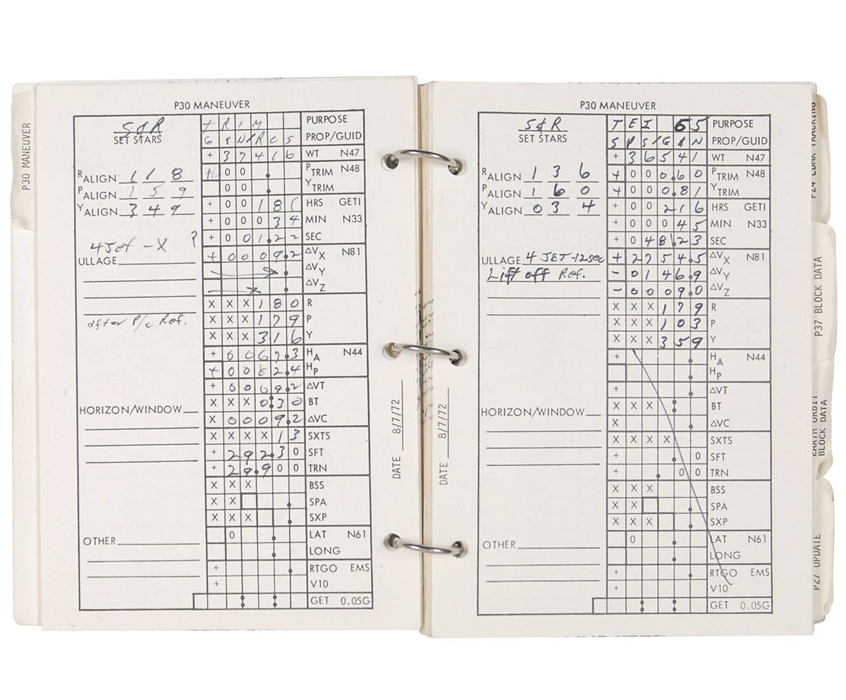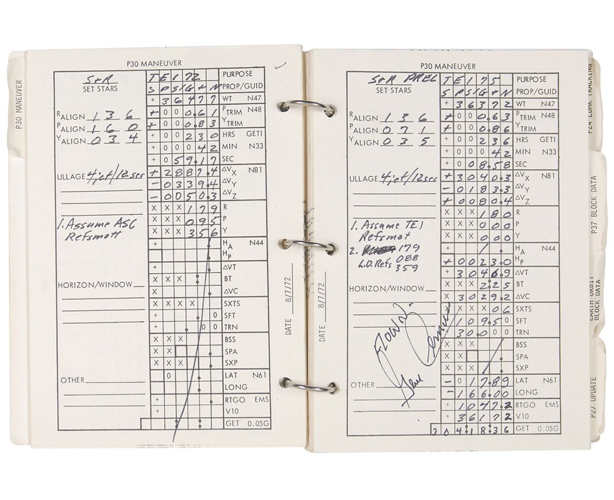 Complete flown Command Service Module Updates checklist carried aboard Apollo 17, used by the entire crew and heavily annotated by Harrison Schmitt or Ron Evans. Checklist consists of 53 heavy cardstock 6 x 8 pages (including covers) bound by 3 metal rings, titled on the front, “Apollo 17, CSM Updates, Part No. SKB32100123–330, S/N 1001,” and boldly certified and signed on the cover by Cernan in blue felt tip, “Flown on Apollo XVII, Gene Cernan.” Of the 51 pages within the checklist, there are 25 pages with writing on them, 21 are heavily noted by Schmitt and Evans with PADs, and four otherwise blank pages are certified and signed by Cernan, “Flown, Gene Cernan.” Each page is dated “8/7/72,” and all but the title page are double-sided. There are six tabs in the checklist: “P30 Maneuver,” “P37 Block Data,” “Earth Orbit Block Data,” “P27 Update,” “P24 LDMK Tracking,” and lastly, “Flight Plan Update.” Cernan has written flown certifications in black felt tip inside the checklist twelve times, each on separate pages (including all tabbed pages except for the first), “Flown, Gene Cernan.” Schmitt and Evan’s mission notes, in bold black felt tip, are all located on the first 11 pages (each double-sided) under the beginning “P30 Maneuver” tab. These pages list subjects such as: “Set Stars,” “R Align,” “P Align,” “Y Align,” “Ullage,” and six columns on which Schmitt and Evan’s recorded a multitude of numbers. Some of their handwritten notes on these pages read: “1. Burn Docked, 2. PTL reformat, 3. LM 36281,” “LM 36281, P - 21, Y - 181, perilun 53.1,” “Burn docked, PTC reformat,” “1. Burn docked, 2. LOI refsmat,” “LM 36312, SING BK 6:51,” “1. Burn and k, 2. Assume DOI-I,” “1. Burn and k, 2. Assume No Circ., 3. -140.9° Long (Lunar) At TIG,” “1. Burn und k, 2. Assume CIRC, 3. -147.62° Lunar Long at Tig,” “At TIG - 178.34, Assumes no plane change,” “4 Jet, 12 sec, TIG = -156.91°, Assumes Trim & LOPC burn, Assumes liftoff refsmmat.” Six of Cernan’s twelve handwritten flight certifications, “Flown, Gene Cernan,” are located on these first eleven pages within the “P30 Maneuver” tab.