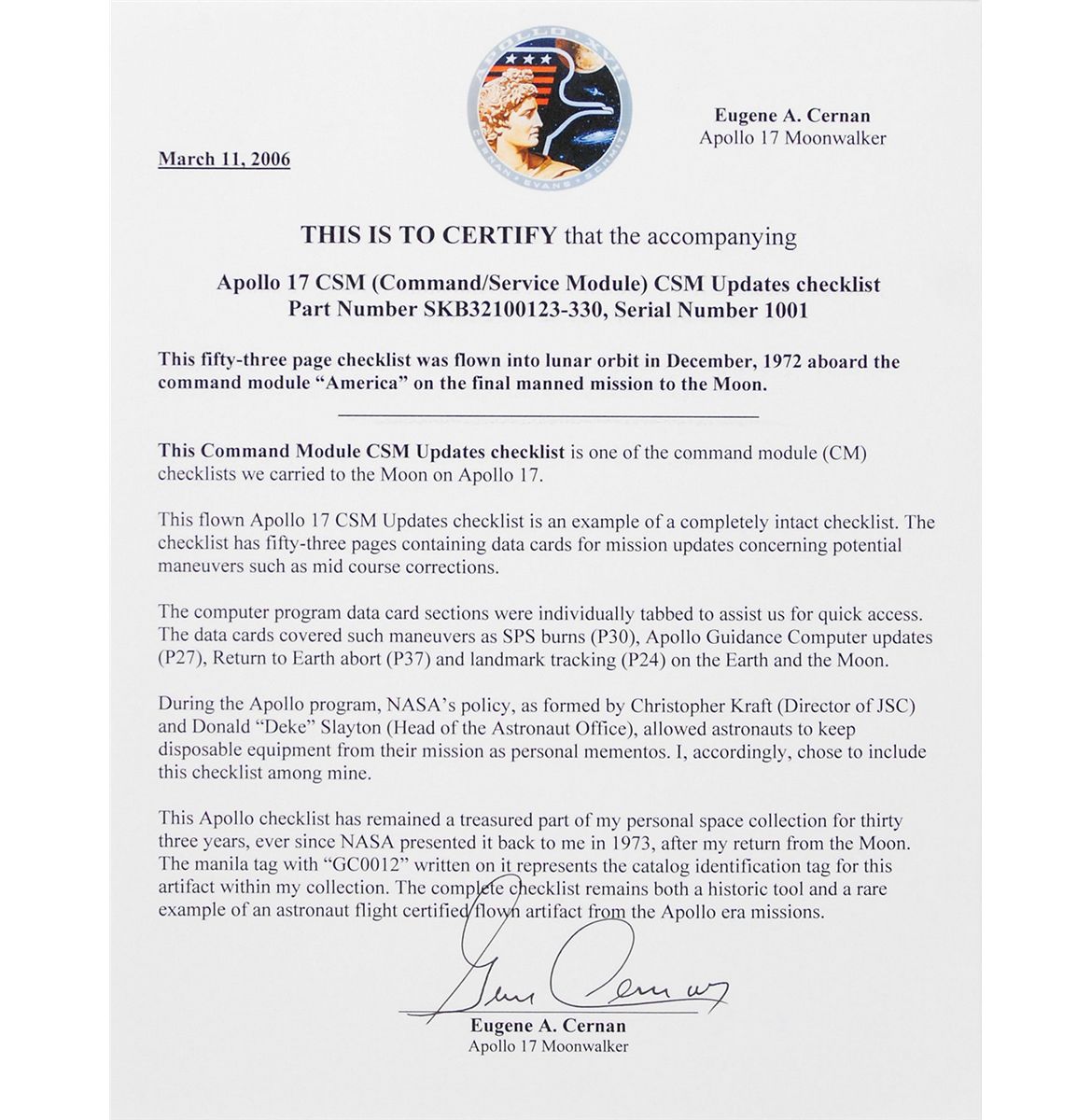 Accompanied by a 2006 certificate of authenticity signed by Cernan, reading, in part: “This is to certify that the accompanying Apollo 17 CSM...Updates checklist...was flown into lunar orbit in December 1972 aboard the command module ‘America’...an example of a completely intact checklist...has fifty-three pages containing data cards for mission updates concerning potential maneuvers such as mid course corrections...the data cards covered such maneuvers as SPS burns (P30), Apollo Guidance Computer updates (P27), Return to Earth abort (P37), and landmark tracking (P24) on the Earth and the Moon...this Apollo checklist has remained a treasured part of my personal space collection for thirty three years, ever since NASA presented it back to me in 1973, after my return from the Moon...the complete checklist remains both a historic tool and a rare example of an astronaut flight certified flown artifact from the Apollo era missions.” Loosely tied to one of the metal rings is Cernan’s own artifact identification manila tag labeled in black felt tip, “GC0012,” which is directly mentioned in his certification letter as a cataloging tool for his personal collection.