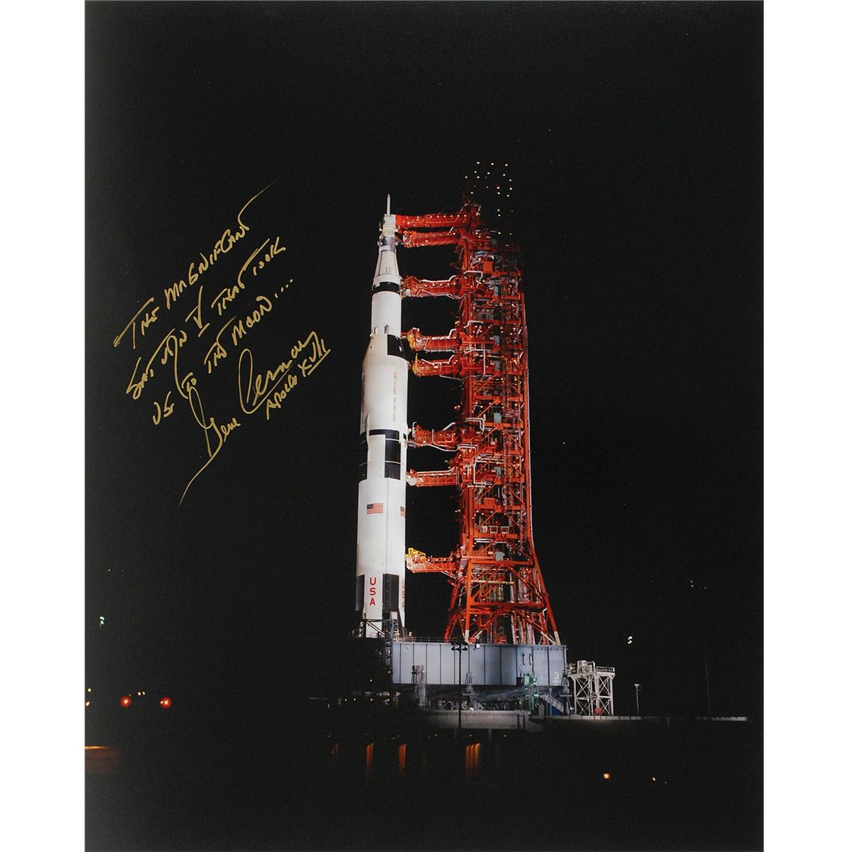 Color satin-finish 16 x 20 photo of the Apollo 17 space craft bathed in spotlights on the launch pad, signed in gold ink, “The magnificent Saturn V that took us to the moon…Gene Cernan, Apollo XVII.” In very fine condition.