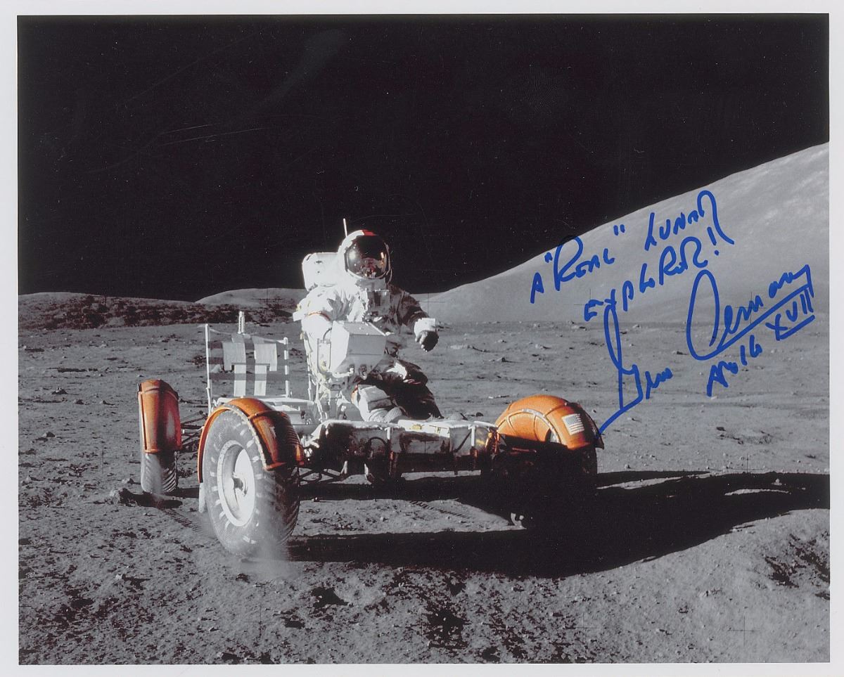 Gorgeous color satin-finish 10 x 8 photo of Cernan riding in the lunar rover on the moon’s surface, signed in blue felt tip, “A ‘Real’ Lunar Explorer! Gene Cernan, Apollo XVII.” In very fine condition.
