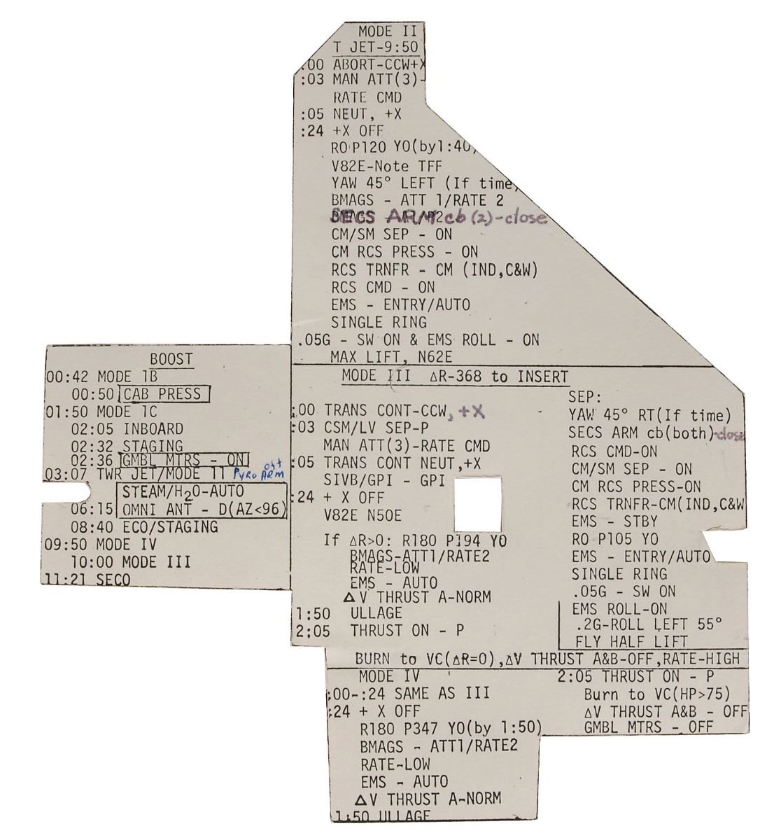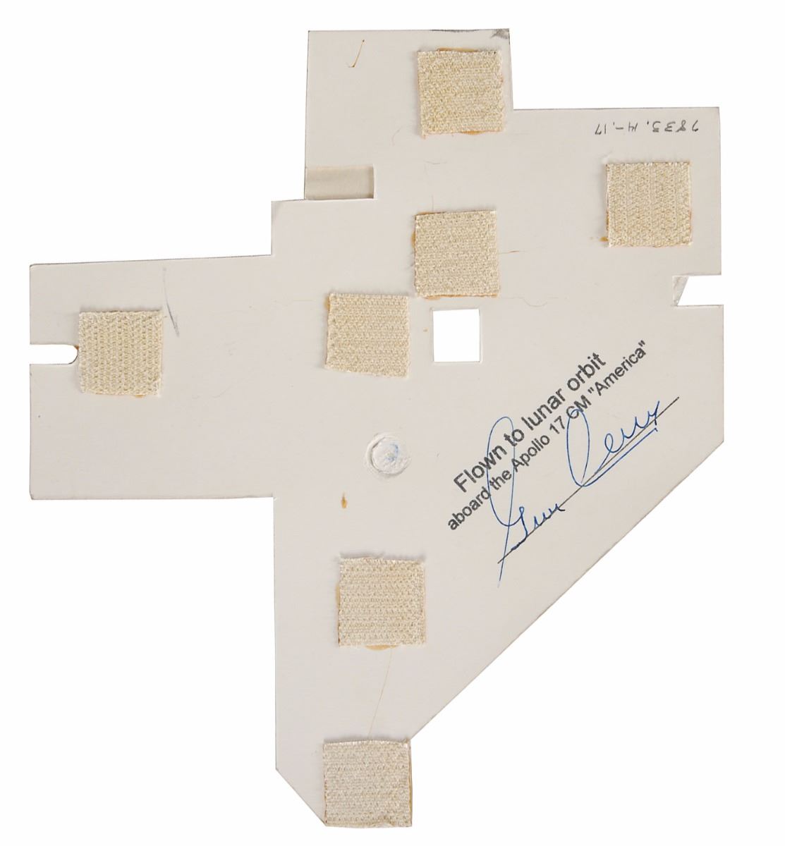 Flown single-sided command module cue card from the Apollo 17 mission, 6.75 x 7.75, stamped on the reverse with flight certification, “Flown to lunar orbit aboard the Apollo 17 CM ‘America,’” and signed in blue ink, “Gene Cernan.” The cue card lists various launch and abort modes related to the lunar module, with affixed Velcro swatches on the reverse so that it could be easily accessible within the spacecraft. In fine condition. An exceptional astronaut-certified piece from this historic final Apollo mission.