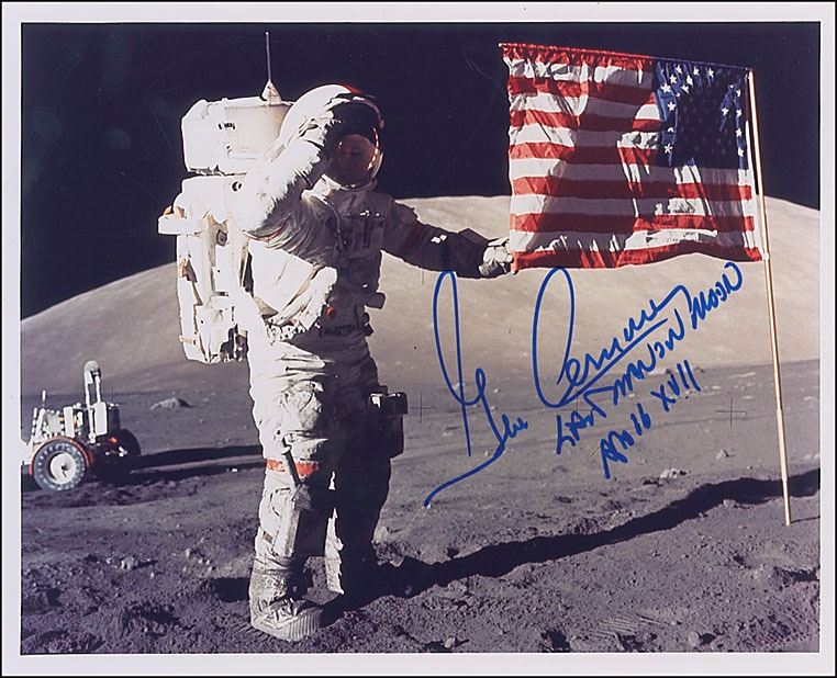 Superb color satin-finish 10 x 8 photo of Cernan saluting the American flag while on the lunar surface, signed in blue felt tip, “Gene Cernan, last man on moon, Apollo XVII.” In very fine condition.