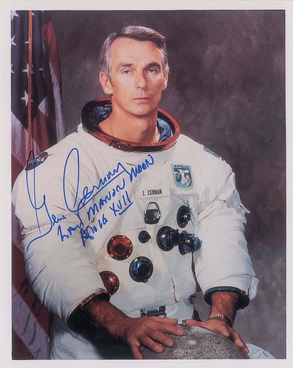 Color satin-finish 8 x 10 photo of Cernan posing in his white space, signed in blue felt tip, "Gene Cernan, Last man on moon, Apollo XVII." In very fine condition.