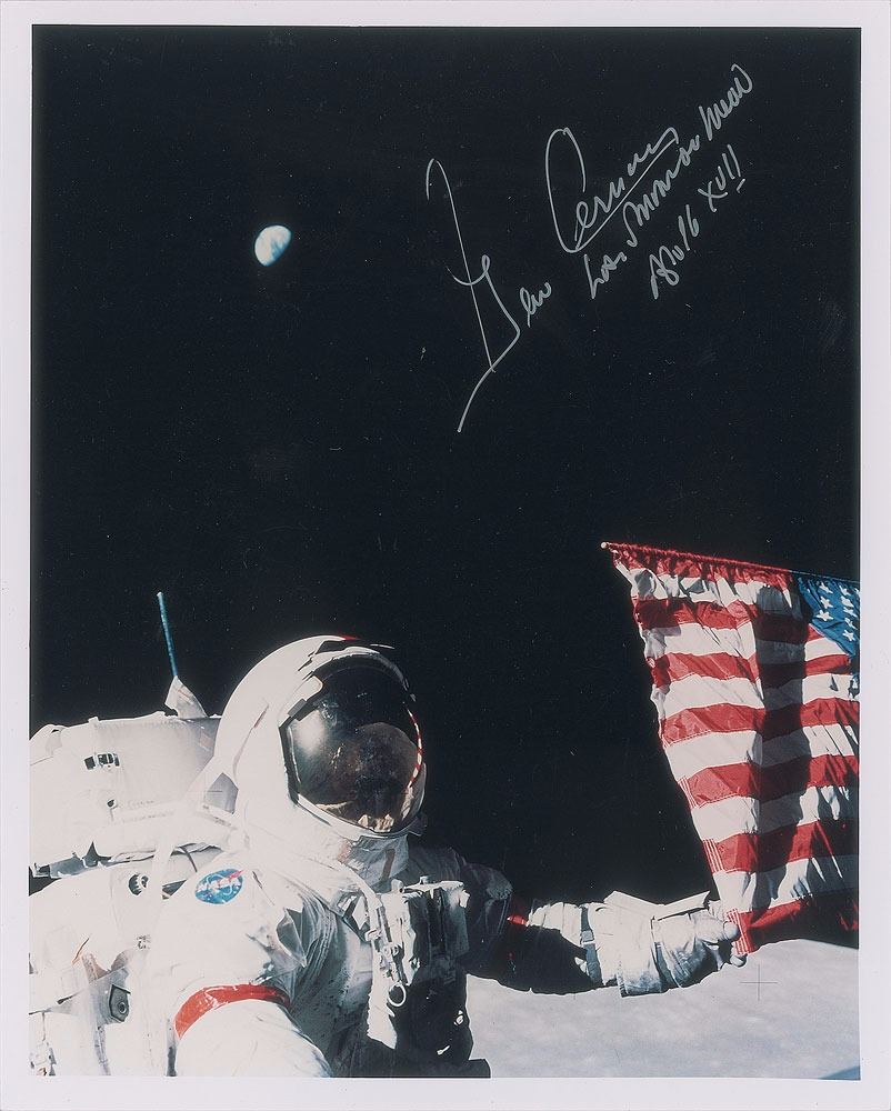 Impressive color semi-glossy 8 x 10 photo of Cernan holding the American flag with a miniscule Earth in the background, signed in silver ink, “Gene Cernan, Last man on moon, Apollo XVII.” In very fine condition.