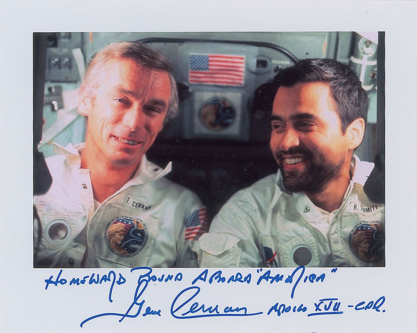 Color satin-finish 10 x 8 photo of the Apollo 17 moonwalkers en route to Earth aboard the Command Service Module America, signed in blue felt tip, "Homeward bound aboard 'America,' Gene Cernan, Apollo XVII—CDR." In very fine condition.