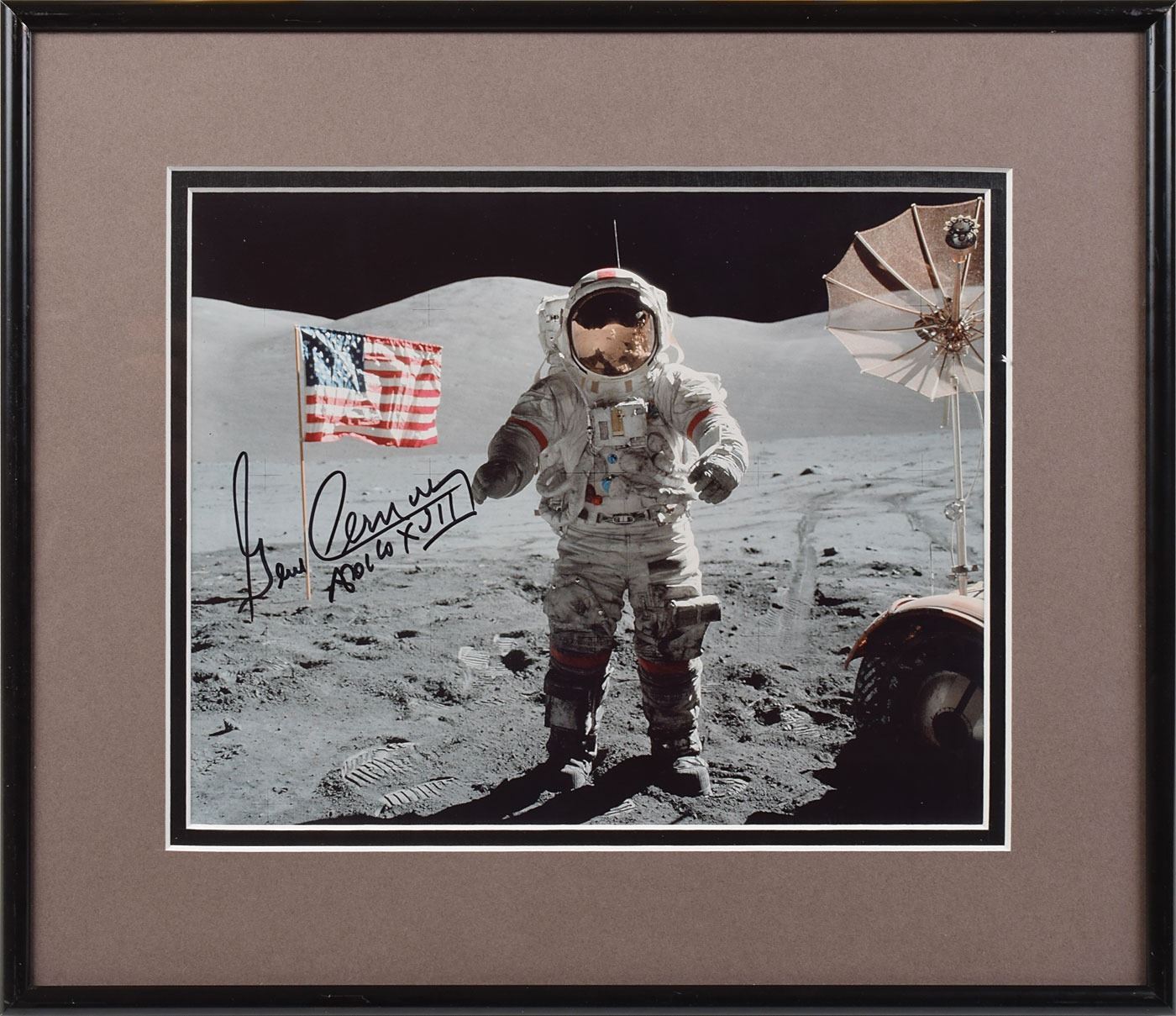 Color semi-glossy 9.75 x 7.75 full-length photo of Commander Cernan standing on the lunar surface between the American flag and the lunar rover, signed in black felt tip, "Gene Cernan, Apollo XVII." Double-matted and framed to an overall size of 14.25 x 12.25. In very fine condition.