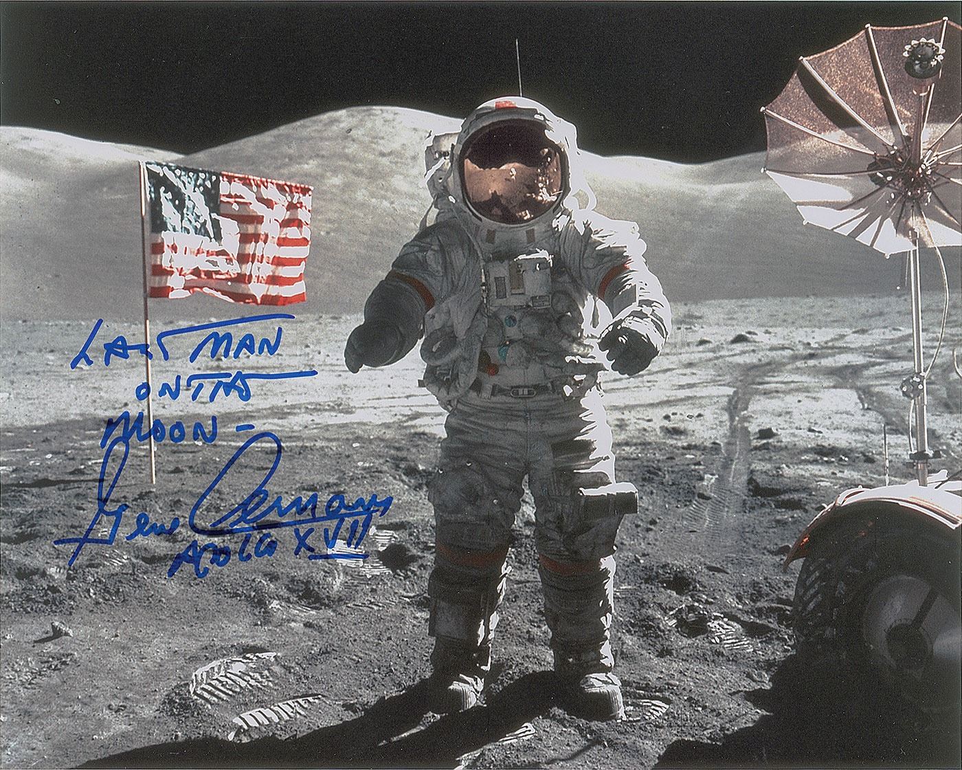 Color semi-glossy 10 x 8 full-length photo of Commander Cernan standing next to the American flag on the surface of the moon, signed in blue felt tip, "Last man on the moon—Gene Cernan, Apollo XVII." In very fine condition. Accompanied by a certificate of authenticity from Novaspace.