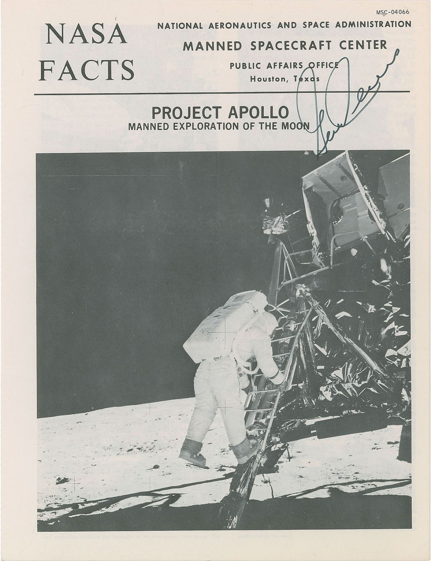 Official NASA Facts brochure about Project Apollo, 8 x 10.5, signed on the front cover in black felt tip by Gene Cernan. In fine condition, with two horizontal mailing folds.