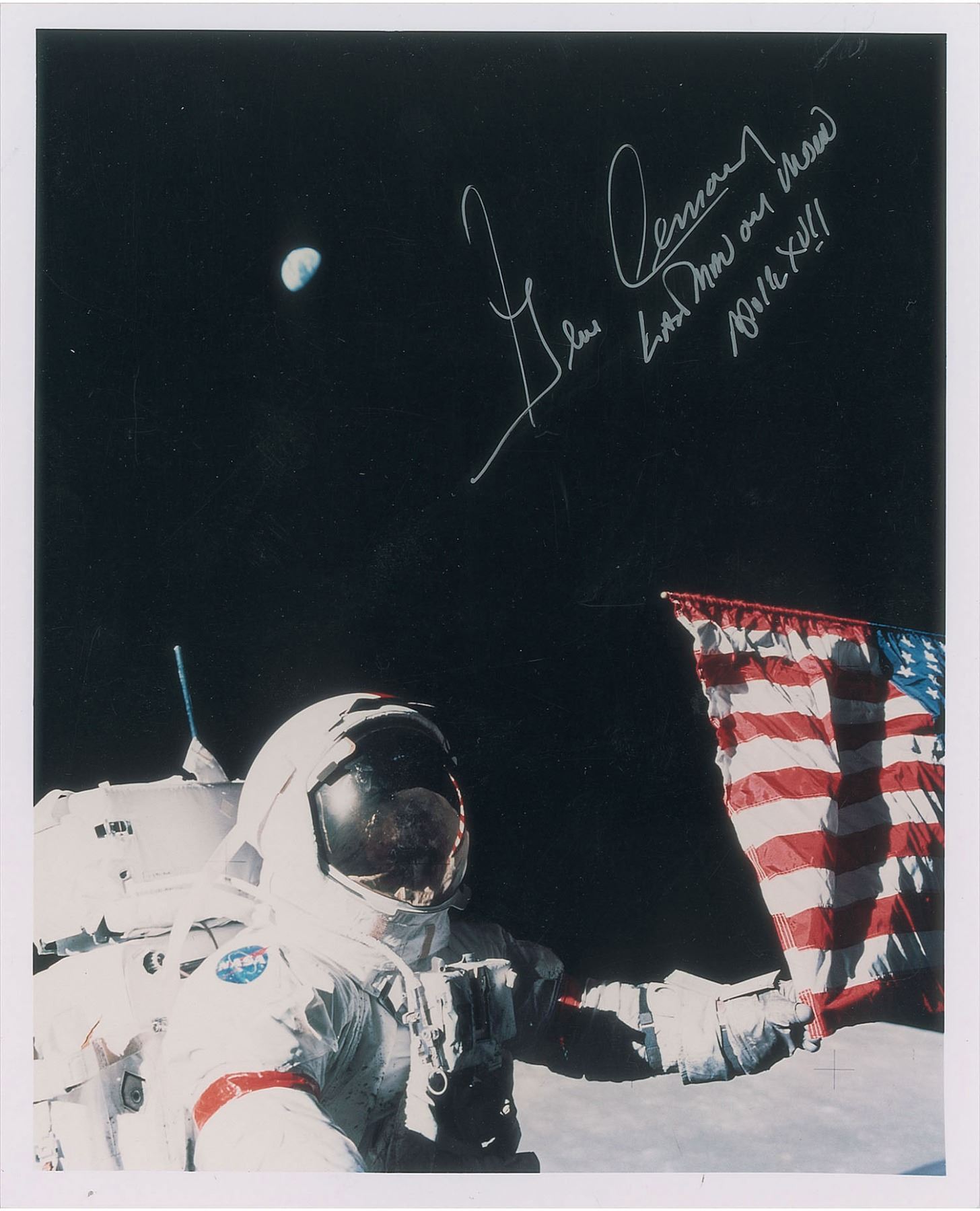 Fantastic color satin-finish 8 x 10 photo of Commander Cernan with the American flag on the lunar surface, Earth in the distant background, signed in silver ink, "Gene Cernan, Last Man on the Moon, Apollo XVII." In very fine condition.