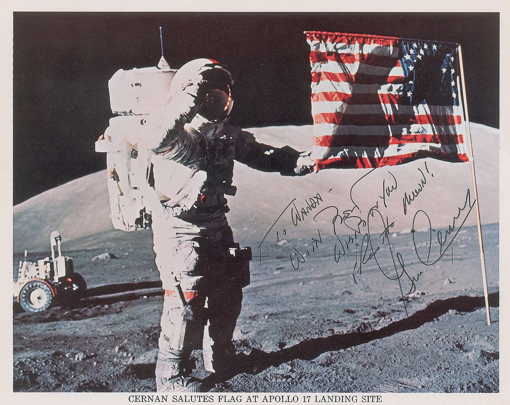 Official color 10 x 8 NASA lithograph of Cernan holding and saluting the American flag on the lunar surface during the Apollo 17 mission, signed and inscribed in black felt tip, "To Wanda—with best wishes to you from the moon! Gene Cernan.” In fine condition.