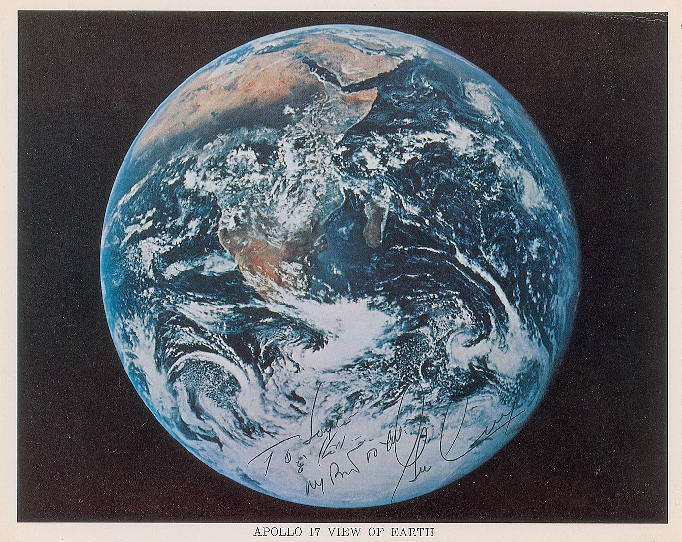 Official color 10 x 8 NASA lithograph of planet Earth as viewed from space during the Apollo 17 mission, signed and inscribed in black ink, "To Joyce & Ken—My best to you, Gene Cernan.” Typed notation on reverse dates the signature to July 1990. In very good to fine condition, with scattered light surface creases.