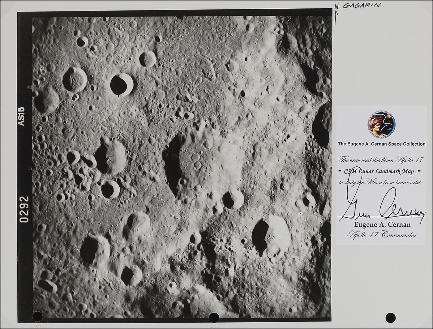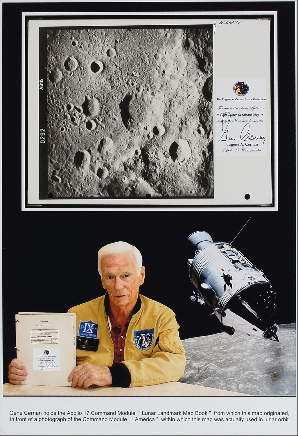 Apollo 17 “Lunar Landmark” map, 10.5 x 8, used in lunar orbit during the Apollo 17 mission. Map shows a portion of the lunar surface, labeled at the top, “N. Gagarin.” This map originates from the personal space collection of Gene Cernan, and bears his personal signed flight-certification label to the right border of the map. Map is removably presented on a 13 x 19 color display picturing Cernan holding the ‘Lunar Landmark Book’ which this map came from. In fine condition, with three punch holes to bottom edge of map. Items flown on any moon mission are difficult to come by and are highly desired by space collectors.