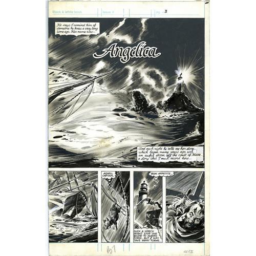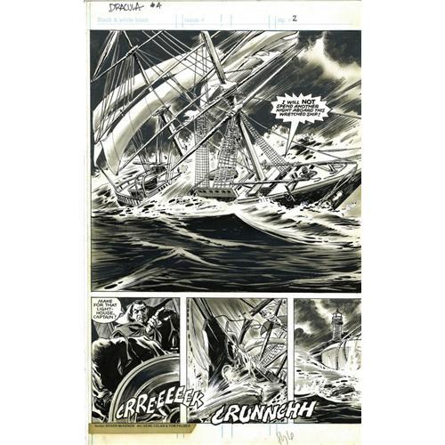 <B>Gene Colan and Tom Palmer - Tomb of Dracula #4 pages 2 and 3 Original Art (Marvel, 1980).</B></I> "Magnificent" seems too tame a word to describe this eye-popping two-page splash depicting a clipper ship roiled about in a typhoon -- while Dracula broods. Colan's masterful pencils have been transformed by Palmer's inks into something greater than the sum of its parts. The rain-choked thunderheads, the arc of lightning, the lonely lighthouse -- all brought vividly to life by a pair of artists at the top of their game. This thundering vista would be the gem of any collection, so don't abandon ship -- bid! The combined image area of the two pages measures 21" x 15". The art is in Excellent condition overall, both pages have been mounted to slightly larger sheets of posterboard.