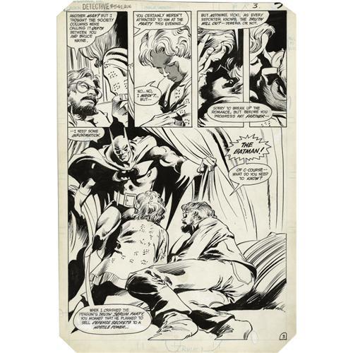 <B>Gene Colan and Bob Smith - Detective Comics #541, page 3 Original Art (DC, 1984).</B></I> The Batman interrupts a romantic moment between Vicki Vale and Bill Modell to get some information on the Penguin, in this page from the Doug Moench story, "C-C-Cold!" The image area measures 10" x 15". The top edge and four corners were trimmed in the production process; otherwise the condition is Excellent. <BR><BR><B>Important notice:</B> Heritage usually auctions material at the rate of 200-250 lots per hour. On some occasions eBay Live bid software or the Internet may not be able to keep up with the pace of the auction. We recommend placing a realistic absentee bid now as insurance to avoid disappointment. Occasionally the auctioneer may eliminate or reject an eBay Live bid, and the auctioneer may also reopen a lot after the close of the eBay live bidding (usually because we missed an audience bid), and may reject your bid even if it shows you as the winning bidder. By bidding via eBay Live, you agree that Heritage may award the lot to another bidder at its sole discretion under the circumstances described above or any other reasonable circumstances. Since eBay bids are not shown to us until we open the lot on the floor, we treat those bids just like floor bids. In most cases the floor responds before the eBay bid is presented to us, due to Internet lag time, so for consistency we have made it a policy that floor bids are always considered first over tie eBay live bids. Also please note that all Heritage lots purchased through eBay Live carry a 22.5% Buyer's Premium. Please make sure you read the Terms and Conditions before you bid. This lot is being auctioned in conjunction with a live floor auction by Heritage Auction Galleries. All final auction and invoice information will be supplied by Heritage Auction Galleries, and all other information should be considered preliminary. Lot:41001 <BR><BR><B>Winning Notification and Billing:</B> After the FINAL session in this auction is complete, Heritage will send e-mail and snail mail invoices. This process normally takes several days. All final auction and invoice information will be supplied by Heritage Auction Galleries, and all other information should be considered preliminary. <BR><BR>This auction will be conducted on a live auction floor and over the Internet through eBay Live. If you choose to place an absentee bid, please take a moment to <font color='#0000ff'><u><a href='http://pages.ebay.com/liveauctions/help/before/laabsentee.html'>learn how eBay Live absentee bidding works</a></u></font><font color='#000000'>