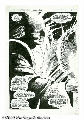 <B>Gene Colan and Bob Smith - Wonder Woman #293, Splash Pages 20 and 21 Original Art (DC, 1982).</B></I> The Adjudicator begins to dissolve the inhabitants of four Earths into oblivion, while the "specimens" he has collected look on powerless to help. It's girl-power to the rescue as Wonder Woman joins forces with Wonder Girl, Starfire, Raven, Supergirl, Phantom Lady, Power Girl, Black Canary, and the Huntress in pages 20 and 21 of the Roy Thomas story, "Countdown to Chaos!" Gene Colan handles the pencils, with inks by Bob Smith. The image area measures 21" x 15", and the pages are in Excellent condition.
