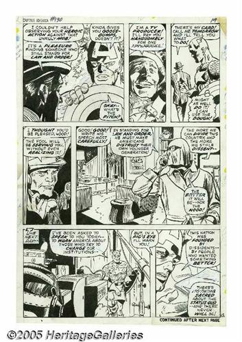 <B>Gene Colan and Dick Ayers - Captain America #130, page 15 Original Art (Marvel, 1970).</B></I> The Hood, in reality a disguised Baron Von Strucker, makes the serious mistake of trying to "spin" Captain America's patriotism with his vile TV script! Gene Colan and Dick Ayers stage the fast-moving scenes of this page perfectly, and Stan Lee's writing shines in the Star-Spangled Avenger's heartfelt dialogue. The image area of the page is 10" x 15", and aside from a pasted-on art correction in the first panel, a few touches of white-out for lettering corrections, and some minor printer's oil stains along the left edge, the art is in Very Good condition.
